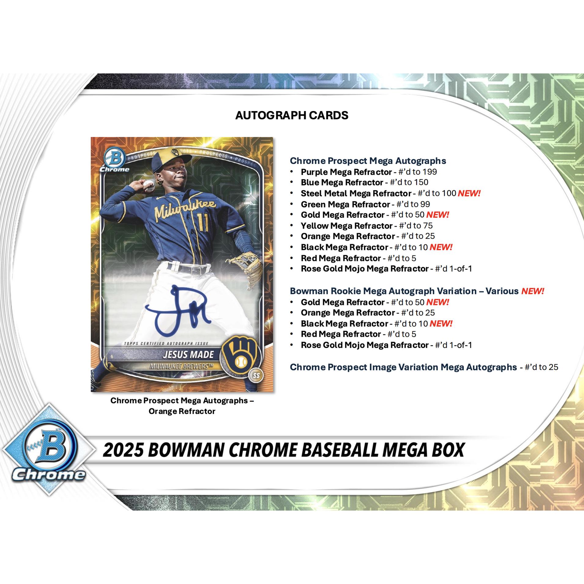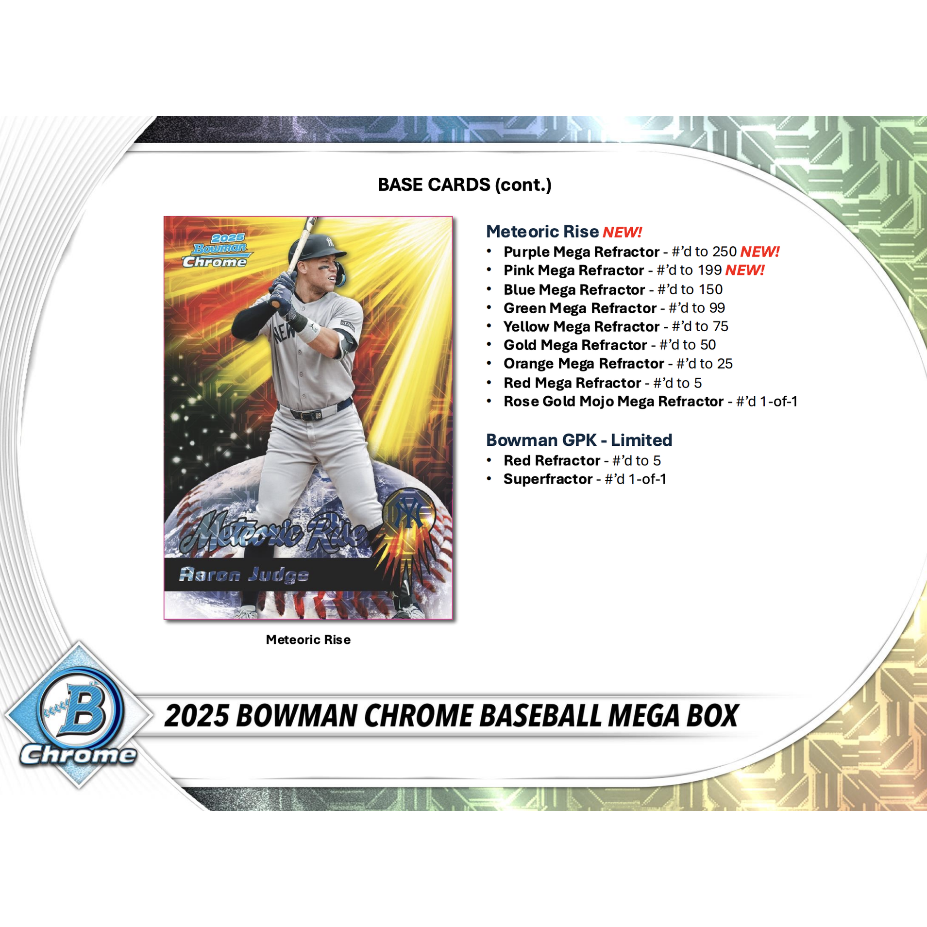 The iconic Bowman Chrome Mega Box is back for 2025, delivering the year’s hottest rookies and prospects with exclusive Mega Chrome patterns only available in this release!