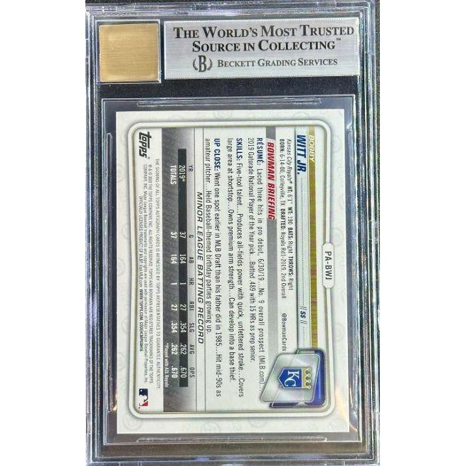 The Bobby Witt Jr. 2020 Bowman Prospect Autographs #PABWJ Beckett 9 is a cornerstone collectible for modern baseball collectors. Featuring an on-card autograph of one of the game’s most electrifying young stars, this Bowman release has become a benchmark for prospect chasers. Graded Beckett 9, the card showcases strong overall condition with high appeal, making it a prized addition for both long-term investors and passionate Bobby Witt Jr. fans.