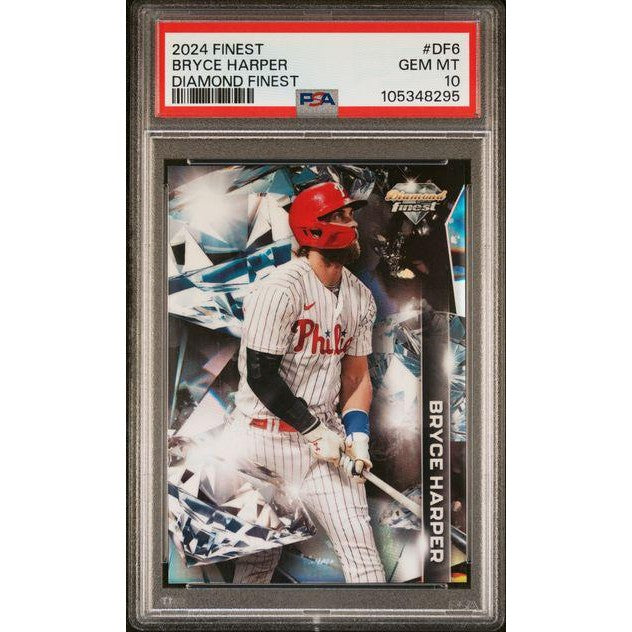 The Bryce Harper 2024 Topps Finest Diamond Finest #DF6 PSA 10 is a must-have for collectors and baseball fans alike. This high-quality card features the iconic Bryce Harper in his prime, encapsulated in the prestigious Topps Finest Diamond Finest series. Rated PSA 10 — a perfect gem mint condition — this card stands as a true testament to Harper’s legacy and his role in the world of professional baseball.