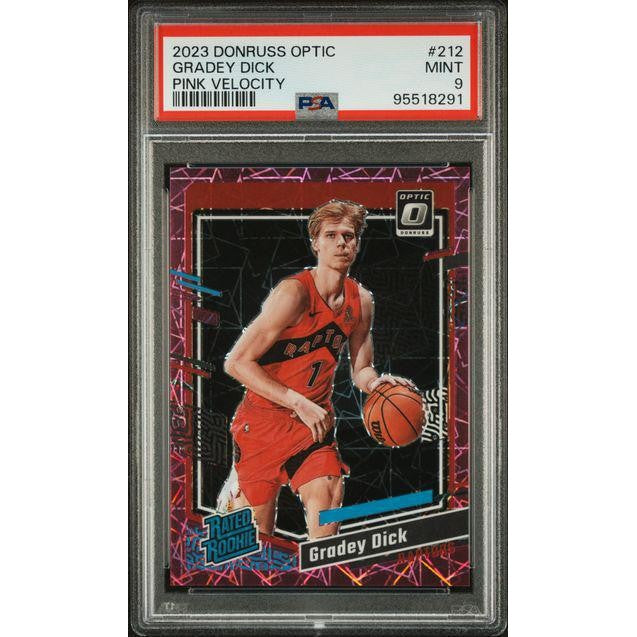 The Gradey Dick 2023 Donruss Optic Pink Velocity PSA 9 combines premium design with a standout rookie parallel. Its flawless condition, vibrant pink finish, and rookie appeal make it an essential addition for collectors focused on the 2023 NBA rookie class.
