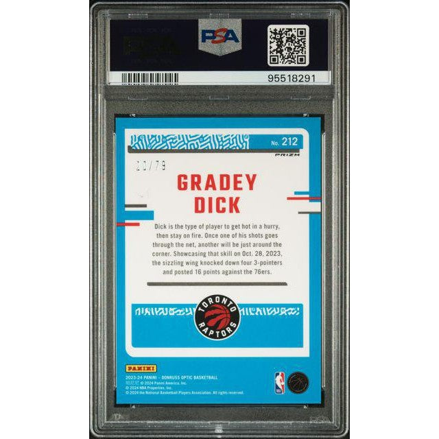 Capture the excitement of one of the 2023 NBA rookie sensations with the Gradey Dick 2023 Donruss Optic Pink Velocity #212, graded PSA 9 Mint. Featuring a vibrant pink Velocity parallel, this card highlights Dick’s promising rookie season with sharp optics, vivid coloring, and dynamic design. A must-have for collectors seeking high-grade, eye-catching NBA rookie cards.