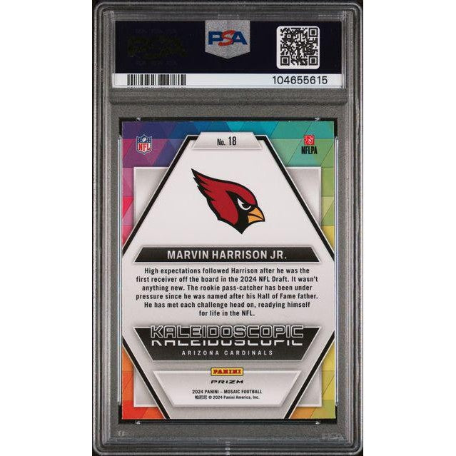Secure one of the first flagship rookie issues of a rising NFL star with the Marvin Harrison Jr. 2024 Mosaic Football Prizm #18 PSA 10. The Mosaic Prizm line is known for its bold chrome finish, vibrant color patterns, and strong hobby demand, making it a must-have for modern football collectors.
