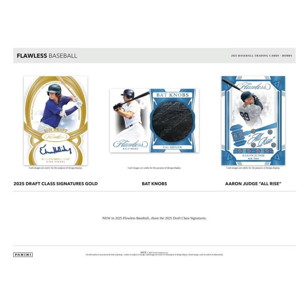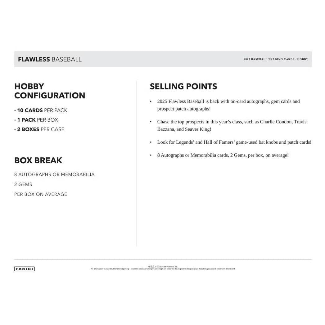 The 2025 Panini Flawless Baseball Hobby Box returns as one of the most prestigious and high-end releases in the baseball card market. Known for its luxury presentation, on-card autographs, embedded gem cards, and premium memorabilia, Flawless delivers an elite collecting experience every year. This presell edition features top prospects from the 2025 draft class, legendary Hall of Famers, and exclusive patch autographs that showcase the future and history of the game. From prospect patch autos to game-used bat knobs and iconic milestone-themed inserts, 2025 Flawless Baseball is built for serious collectors chasing true centerpiece cards.