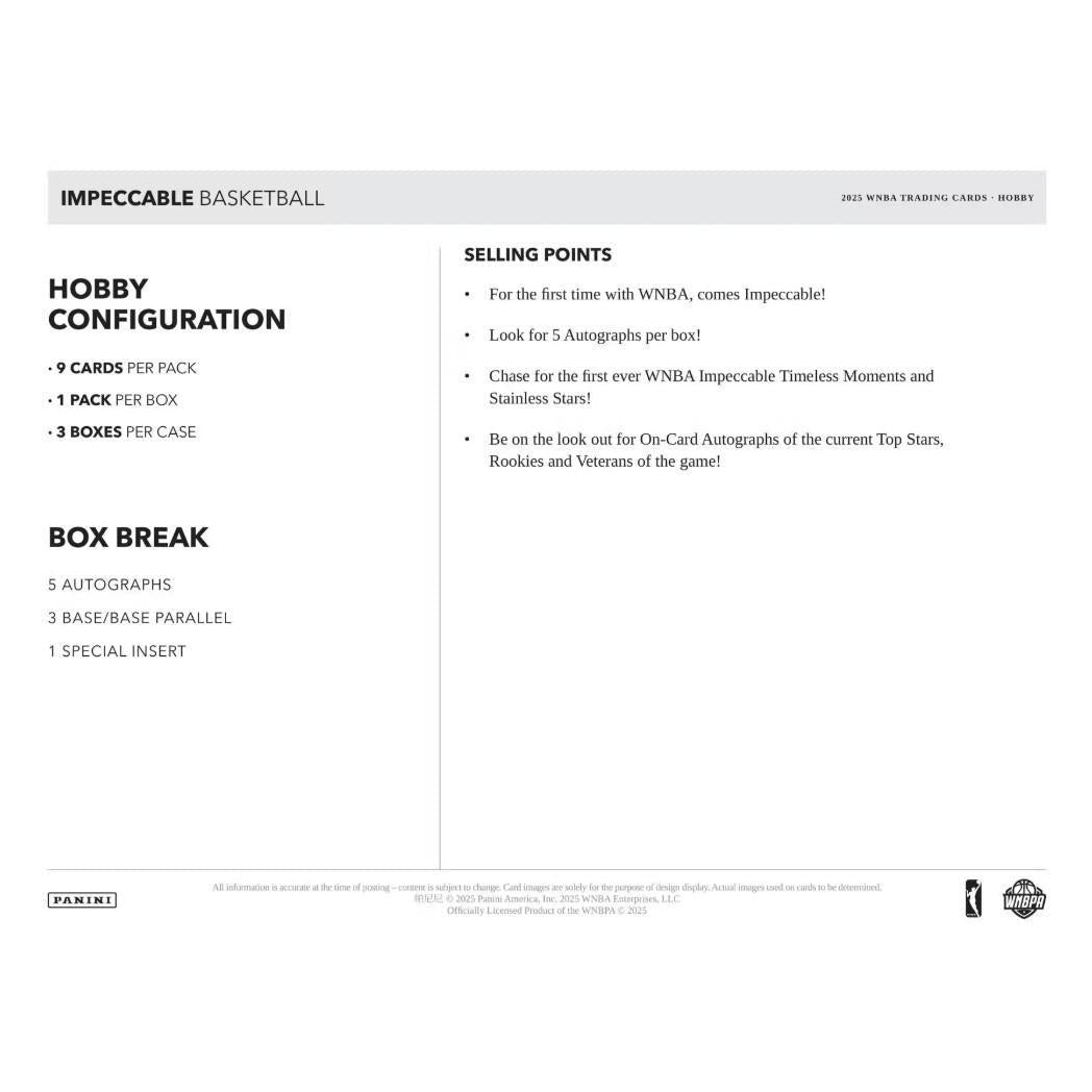 For the first time ever, Panini brings its ultra-premium Impeccable brand to the WNBA with the 2025 Panini Impeccable WNBA Basketball Hobby Box. This landmark release delivers a high-end collecting experience featuring elegant card designs, hard-signed on-card autographs, and limited special inserts celebrating the stars of women’s basketball. From legendary icons to today’s top rookies and veterans, Impeccable WNBA captures the league at its finest.