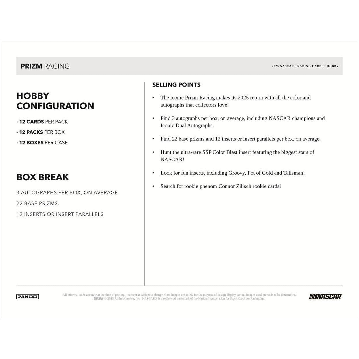 The 2025 Panini Prizm Racing Hobby Box brings the iconic Prizm chrome finish to the world of motorsports, delivering bold designs, vibrant parallels, and premium autograph content. Featuring top NASCAR stars, rising drivers, and fan favorites, this release combines high-energy visuals with strong hit potential. With multiple autographs per box and a deep mix of base Prizms and inserts, Prizm Racing offers a fast-paced break experience built for modern racing collectors.