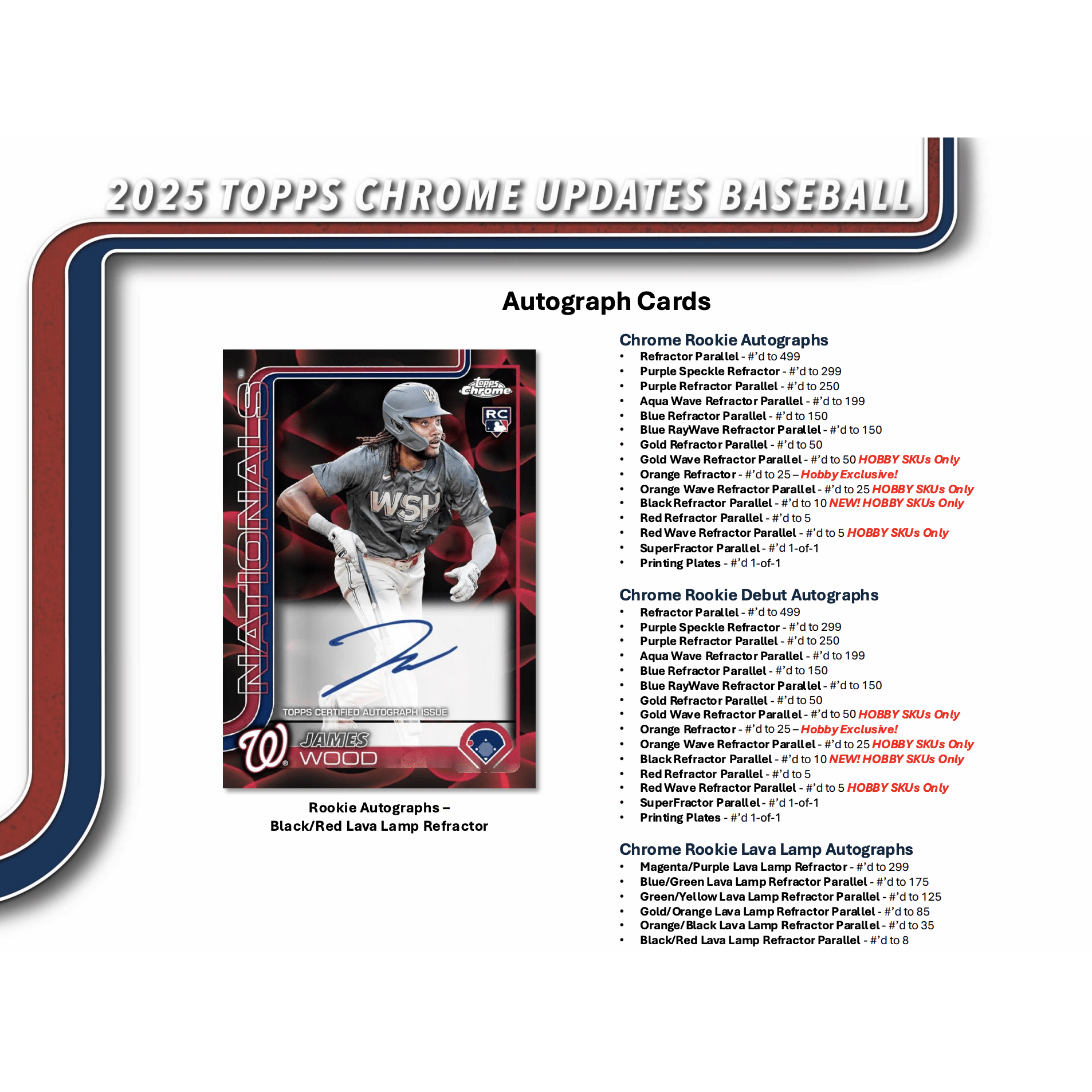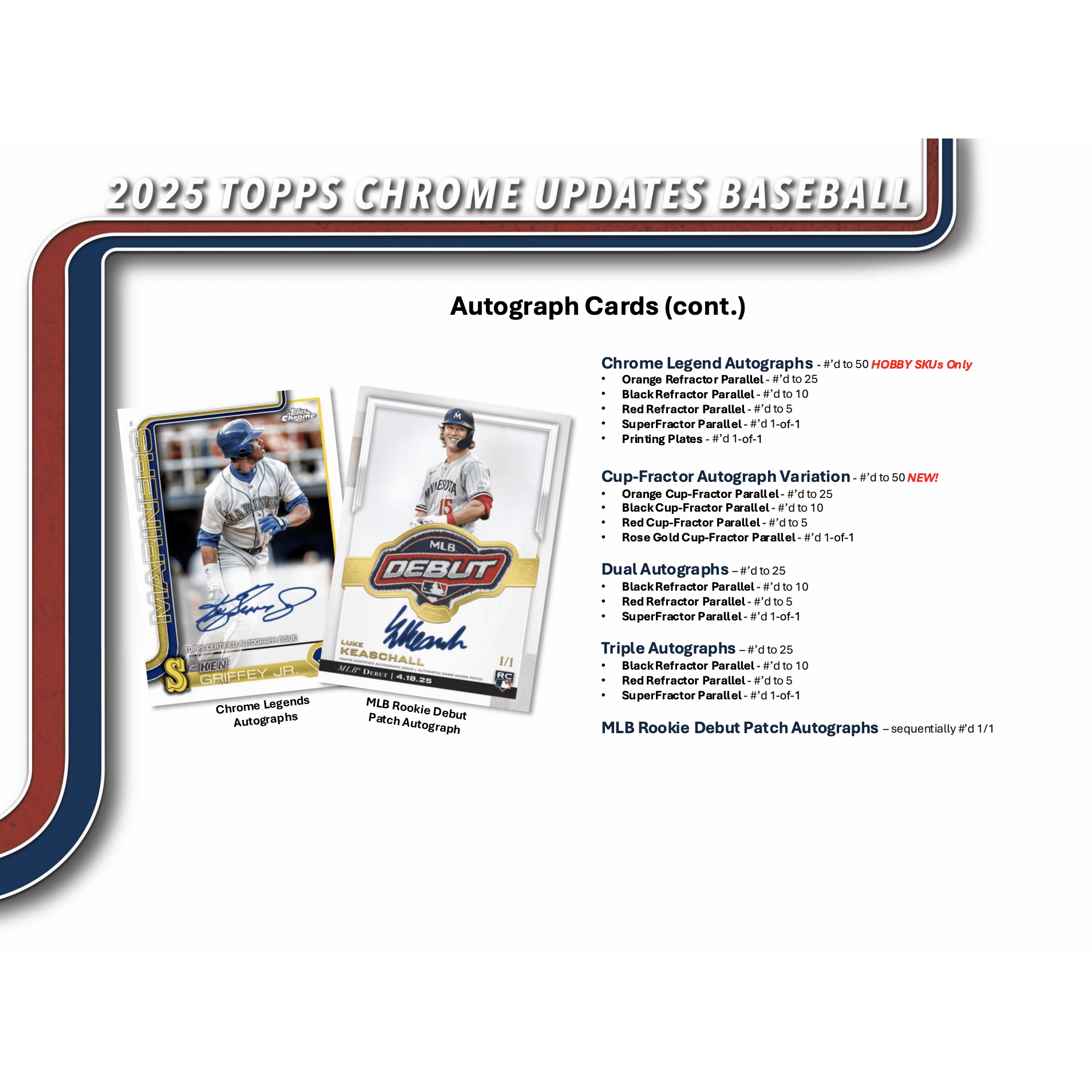 With one autograph per box on average and multiple chances at low-numbered color, the 2025 Chrome Update Series delivers the flash, chase, and collectability that Chrome collectors expect each season.