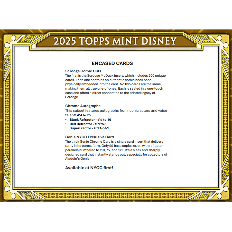 2025 Topps Mint Disney brings the bold, imaginative world of Disney to life through a high-end trading card experience! Launching as a convention-exclusive release at the 2025 New York City Comic-Con, this collectible box is crafted for fans and collectors who appreciate exquisite design, limited-edition parallels, and a direct link to Disney’s timeless storytelling legacy.