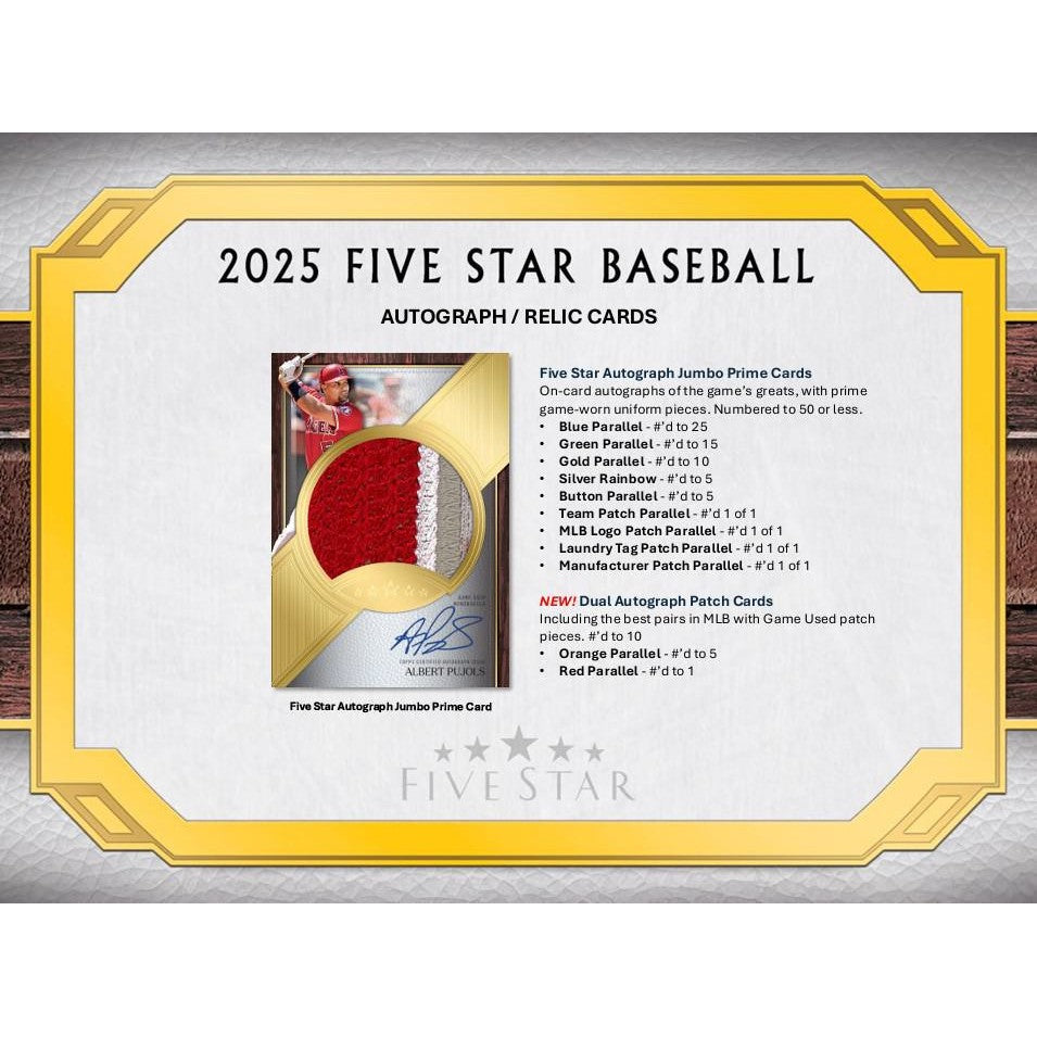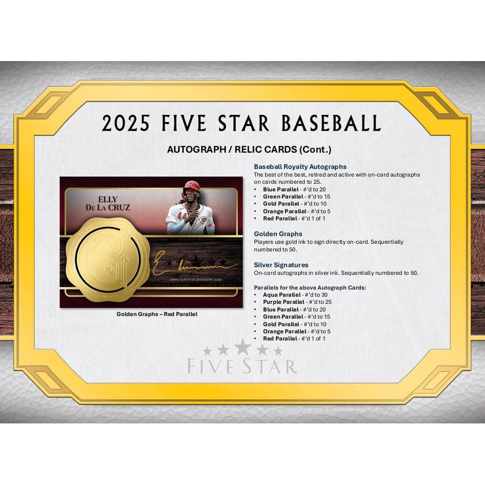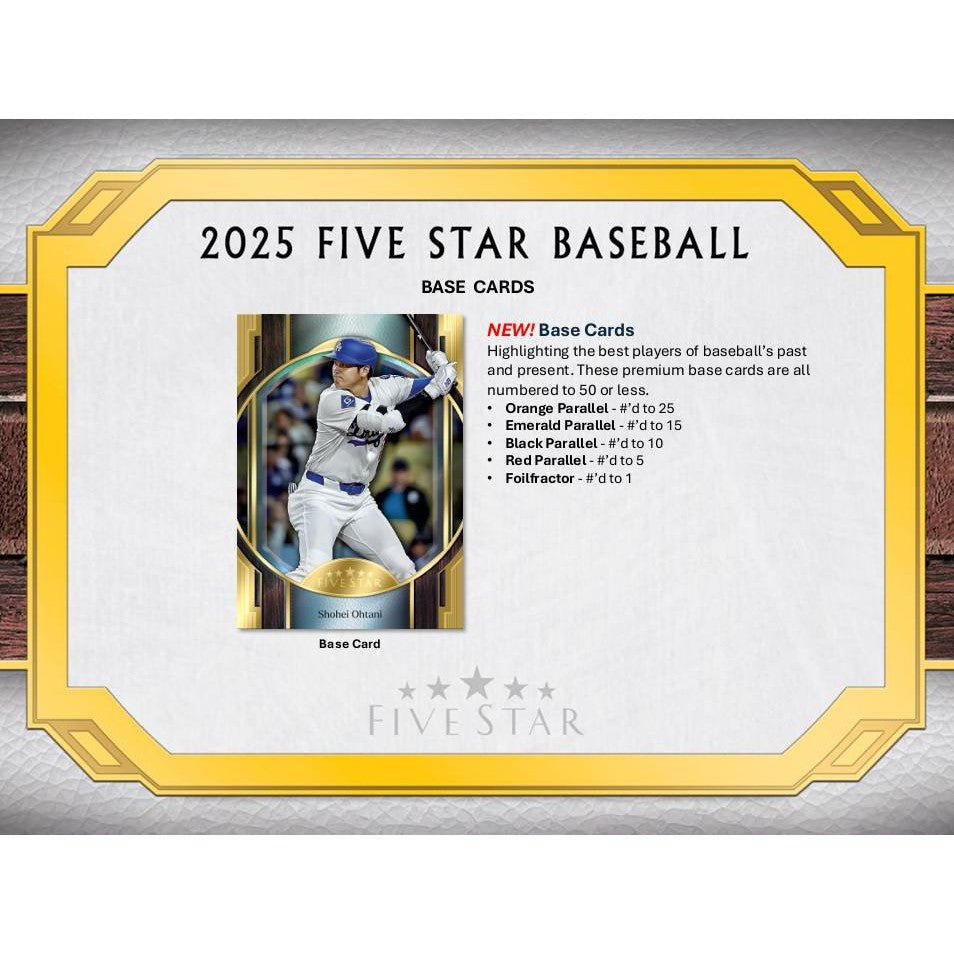 Each hobby box guarantees five on-card autograph cards, all numbered to 199 or less, plus a low-numbered base card. Collectors can chase acetate autographs, color ink signatures, auto relics, and ultra-rare case hits, including stunning 1-of-1s and shadowbox autograph designs. With premium materials, elite checklist depth, and a focus on autograph content, 2025 Five Star Baseball stands out as a must-have luxury release.