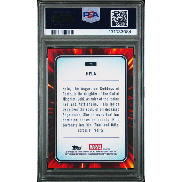 The Spider-Web Refractor design adds a bold, layered look that elevates Hela’s presence on the card. Combined with a Mint PSA 9 grade, this piece delivers both visual impact and strong modern collectability—ideal for collectors building a premium Marvel Chrome lineup.