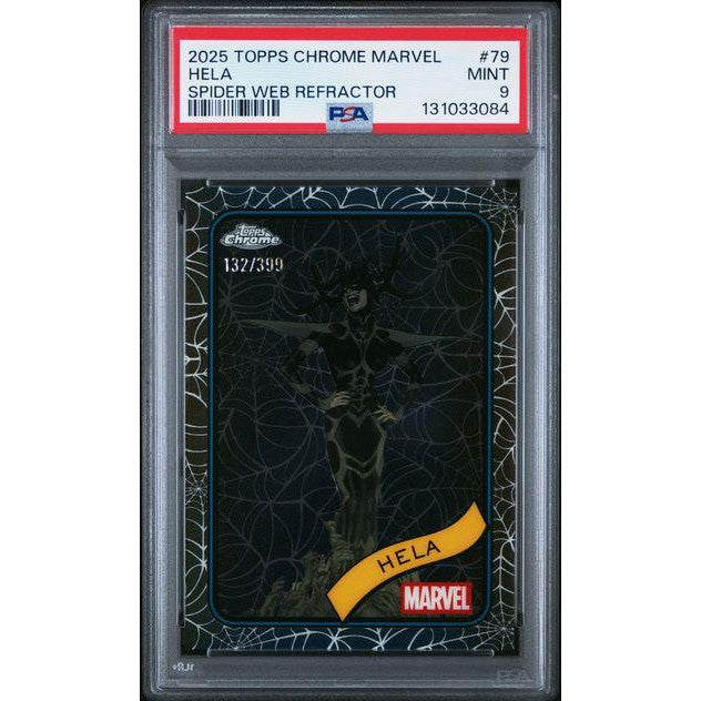 This Hela 2025 Topps Chrome Marvel #79 features the visually striking Spider-Web Refractor pattern, adding depth and texture to Topps Chrome’s sleek finish. Graded PSA 9, the card offers sharp presentation and strong eye appeal, highlighting one of Marvel’s most formidable and visually iconic villains. It’s a standout modern Marvel collectible with premium parallel styling.