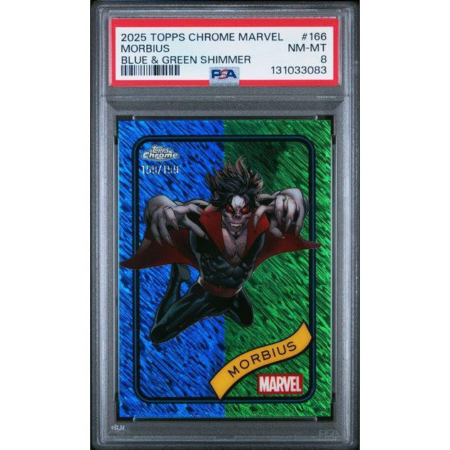 Topps Chrome Marvel is known for its bold finishes and high-energy artwork, and the Blue & Green Shimmer parallel elevates this Morbius card even further. With a PSA 8 grade, it balances strong eye appeal and collectible confidence, making it an excellent modern Marvel slab for display or long-term collecting.