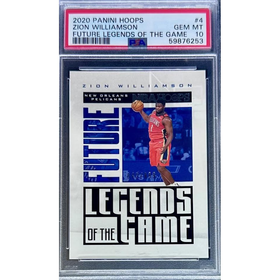 The Zion Williamson 2020 Panini Hoops Future Legends of the Game #4 PSA 10 is a high-grade rookie insert highlighting one of the NBA’s brightest young stars. Featuring clean design, vibrant imagery, and a perfect Gem Mint grade, this card is a top-tier collectible for modern basketball enthusiasts.