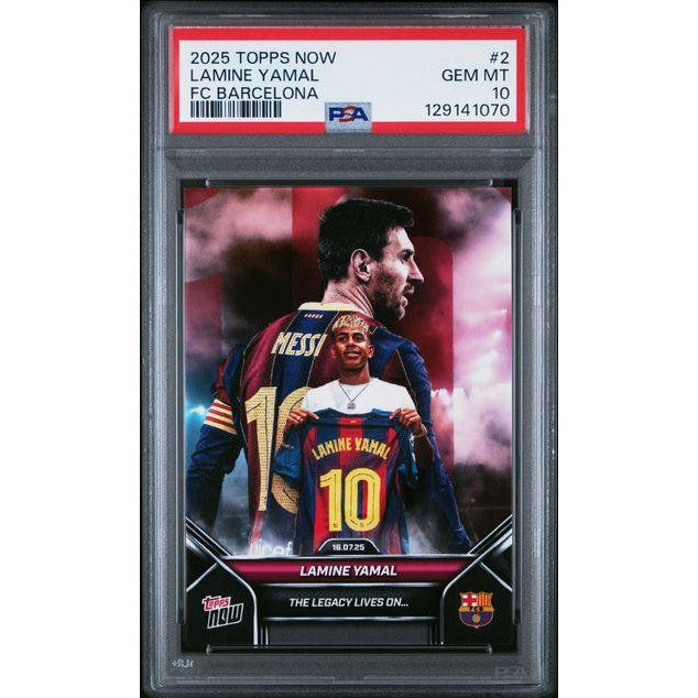 Capture a defining moment in modern football with this 2025 Lamine Yamal Topps Now FC Barcelona #2, graded PSA 10 Gem Mint. Topps Now cards are produced to commemorate real-time milestones and historic performances, making them some of the most relevant and time-specific collectibles in the hobby. This release highlights Lamine Yamal during his continued rise as a generational talent for FC Barcelona and world football.