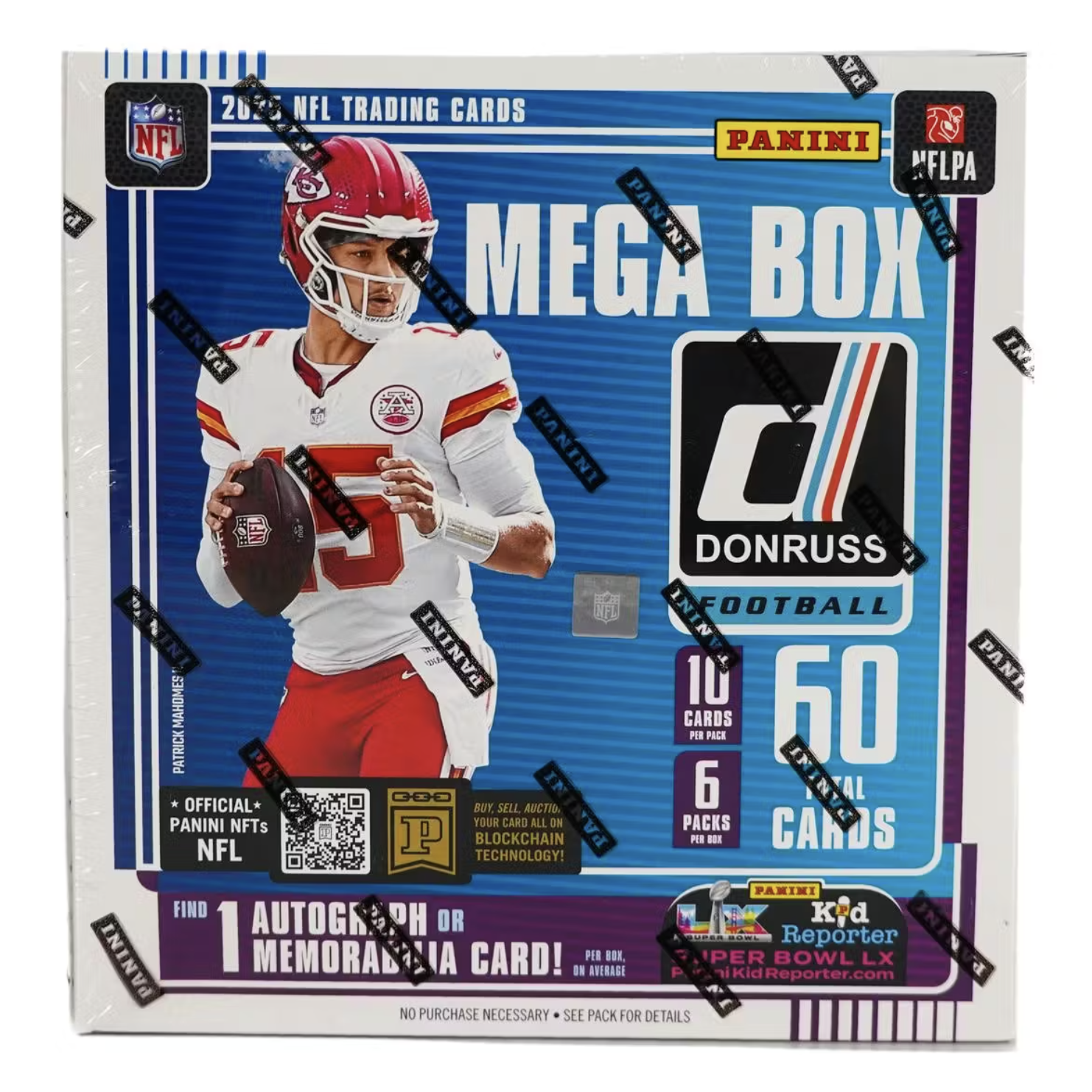 The flagship Donruss Football brand returns for 2025 with a massive 400-card base set featuring 300 veterans and legends and 100 Rated Rookies. This release delivers a colorful mix of parallels, autographs, and some of the hobby’s most iconic insert sets. Chase fan-favorite designs like Rated Rookies, Gridiron Kings, and Downtown!, along with Mega Box–exclusive Green Parallels and Optic Rated Rookie Preview cards.