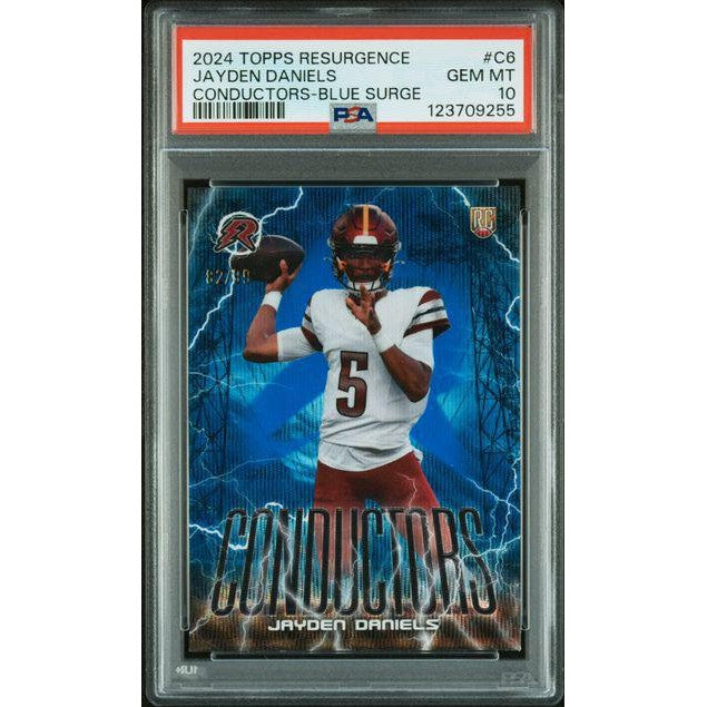 Elevate your collection with the Jayden Daniels 2024 Topps Resurgence Conductors – Blue Surge #C6 PSA 10, a premium rookie card from Topps’ dynamic Resurgence Conductors series. Featuring Daniels in high-energy rookie action, this Blue Surge parallel stands out with vibrant colors and sharp design, perfect for collectors seeking visually striking NFL rookie cards.