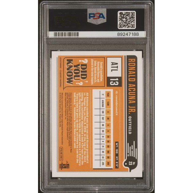 Graded PSA 10 (Gem Mint), this card features pristine corners, vibrant color, and a flawless surface—making it a standout addition to any modern baseball collection. With Acuña Jr. cementing himself as one of MLB’s premier stars, this rookie-year collectible is both visually striking and highly desirable for investors and fans alike.