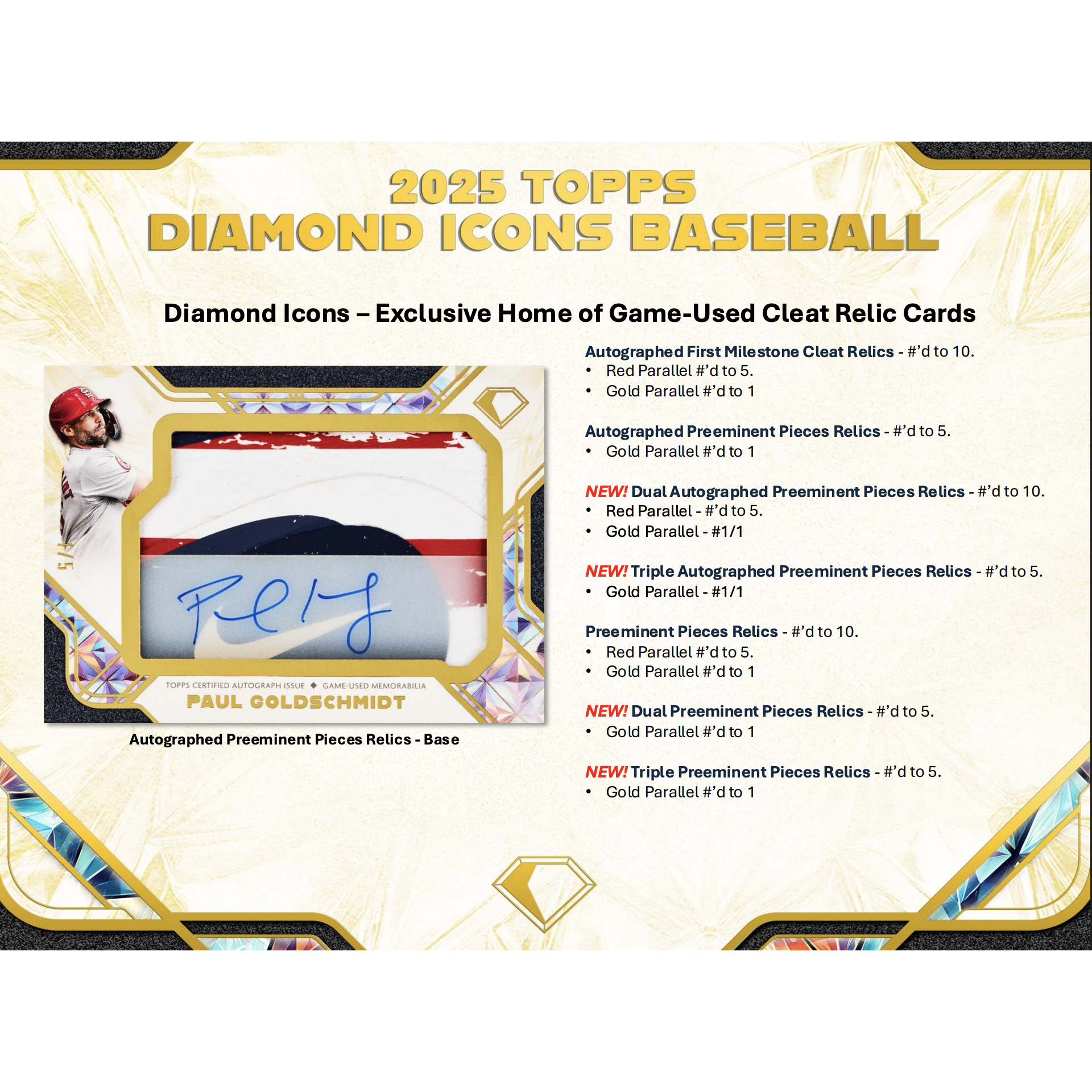 The crown jewel of the Topps high-end baseball lineup returns with the 2025 Topps Diamond Icons Baseball Hobby Box, delivering some of the most luxurious and limited cards in the hobby. Each box contains 9 autographs and 1 relic, featuring a stunning mix of on-card signatures, multi-color patches, and authentic game-used memorabilia from baseball’s greatest legends, current stars, and future icons.