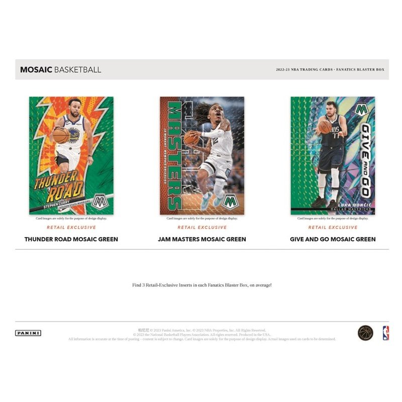 Unlock a unique collecting experience with the 2022-23 Panini Mosaic Hobby Blaster! Every box is packed with six packs of six cards each, including 4 Prizms, 3 Inserts. Look for exclusive parallels like Mosaic Green Ice. Plus, find epic insert sets like Elevate, Jam Masters, Epic Performers, Thunder Road, and Give and Go - all in one blaster! Dive into the thrill of collecting!
