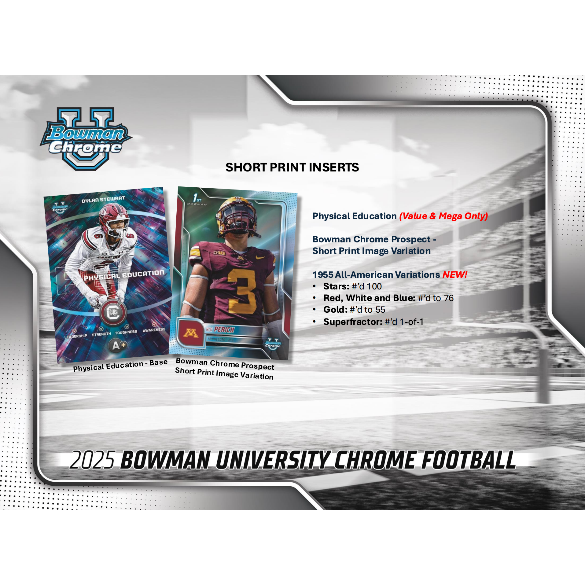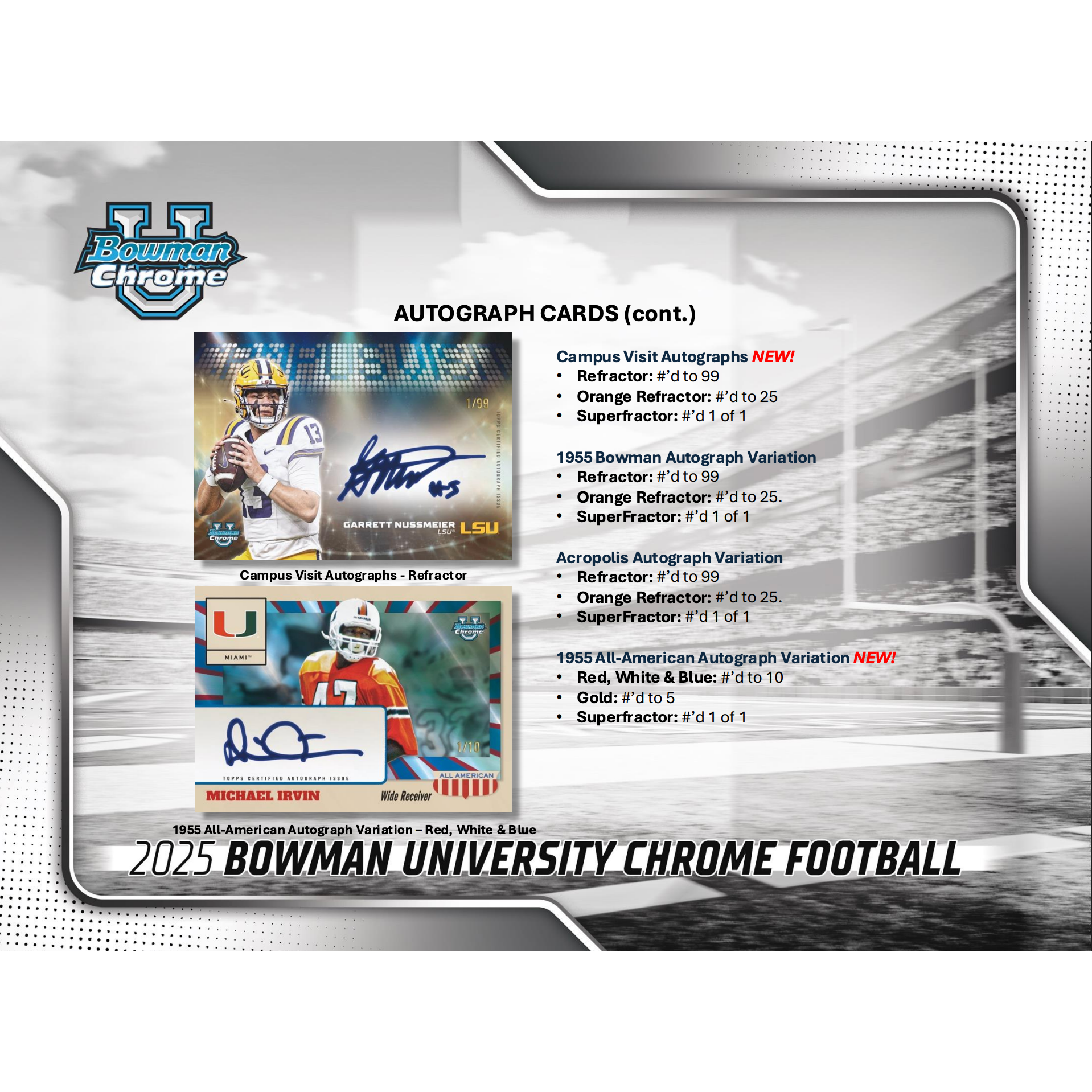 Get ready to storm the field — Bowman Chrome University Football is back for the 2025 College Football season! Featuring the top prospects from across the nation, this year’s release delivers a loaded 200-card base set and the first-ever Bowman cards for many collegiate standouts.