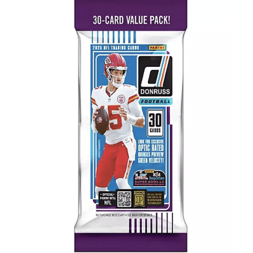 The flagship Donruss Football brand returns for 2025 with a massive 400-card base set featuring 300 veterans and legends and 100 Rated Rookies. This single Jumbo Value Pack delivers a strong mix of rookies, inserts, and exclusive parallels, making it a great rip for collectors chasing Rated Rookies and Press Proof Blue Parallels.
