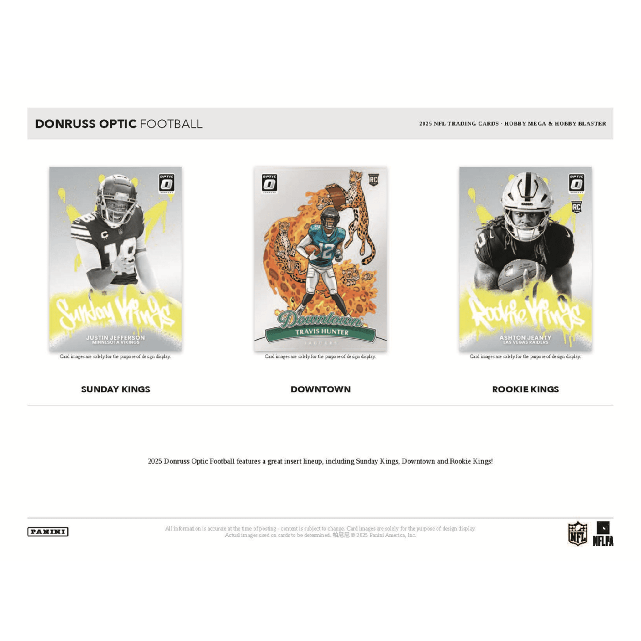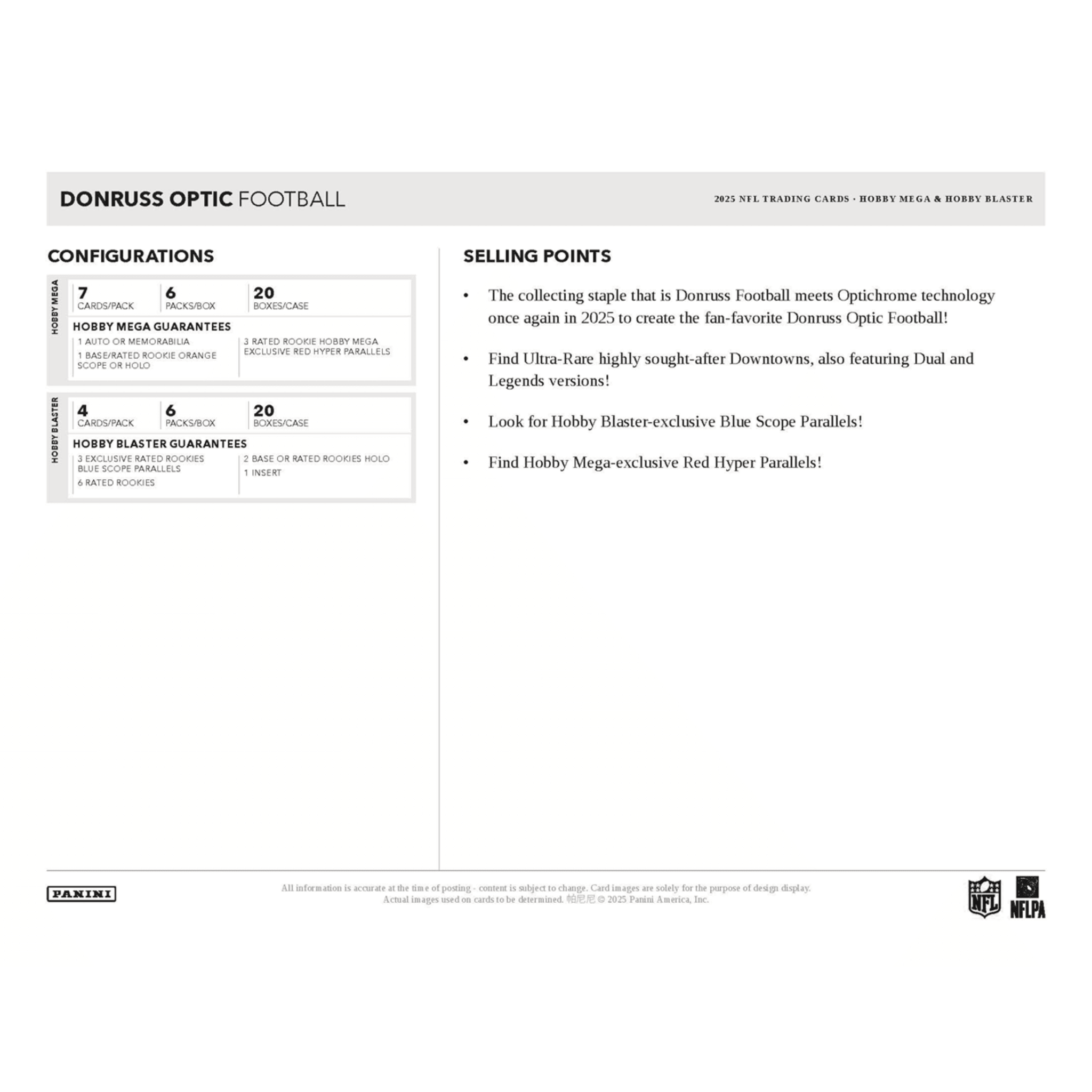 The collecting staple that is Donruss Football meets Optichrome technology once again in 2025 to deliver the fan-favorite Donruss Optic Football. This Hobby Mega Box offers collectors a strong mix of hits, exclusive parallels, and premium Optichrome shine. Chase Ultra-Rare Downtown inserts, including Dual and Legends versions, and look for Hobby Mega-exclusive Red Hyper Parallels featuring top rookies and stars from the 2025 season.