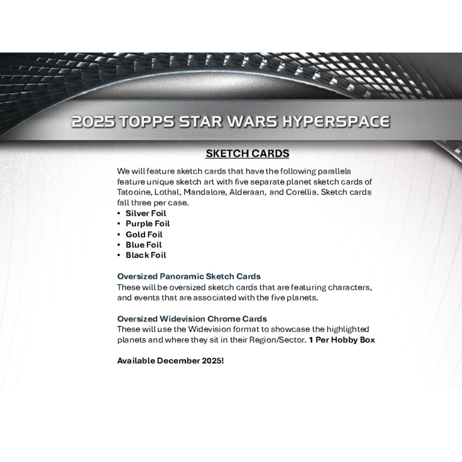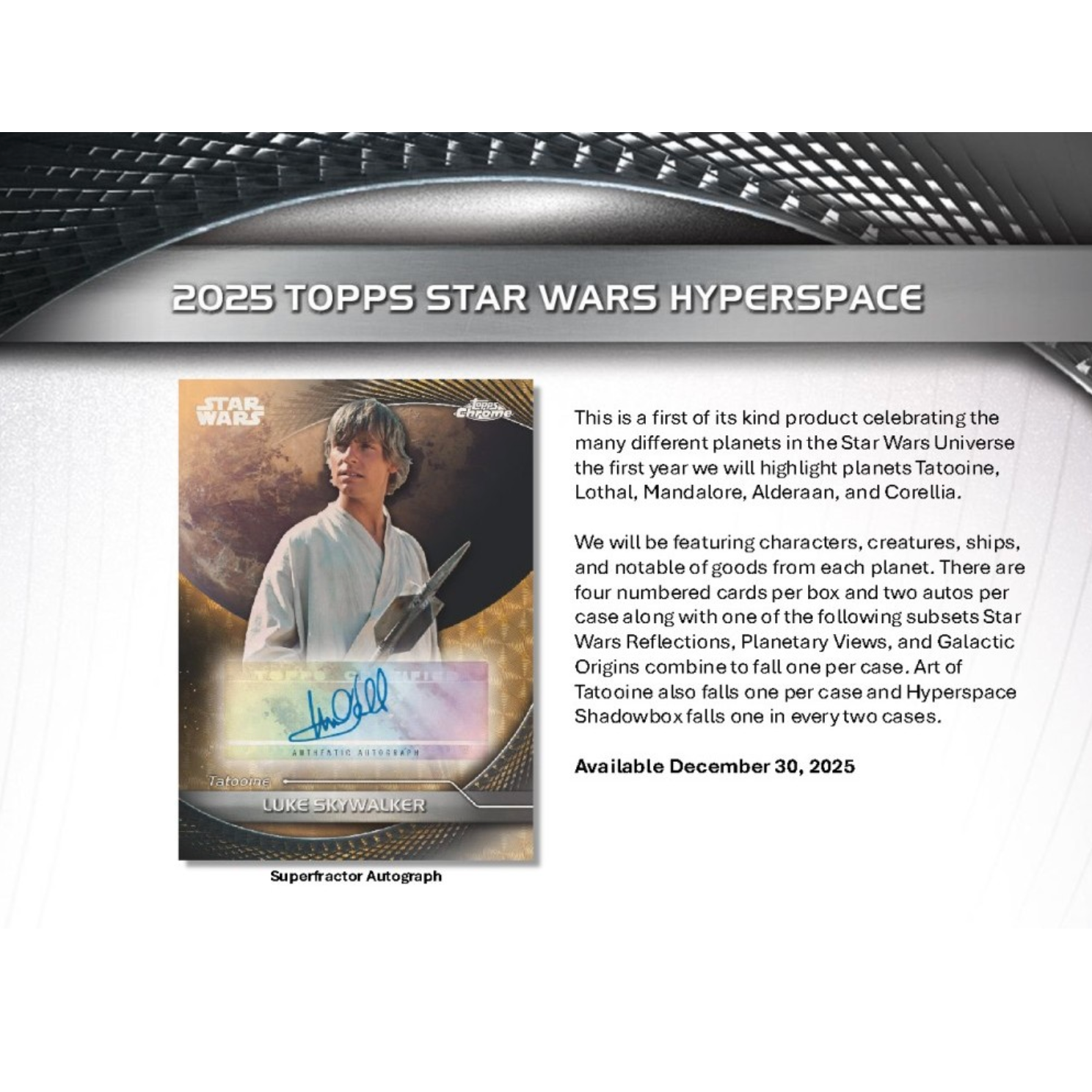 2025 Topps Star Wars Hyperspace debuts as a first-of-its-kind release that explores the rich worlds of the Star Wars galaxy. This inaugural edition spotlights five iconic planets—Tatooine, Lothal, Mandalore, Alderaan, and Corellia—across a fully themed 100-card base set featuring characters, creatures, ships, and notable goods from each world. Collectors can expect a vivid mix of refractor parallels, numbered variations, and planet-specific content, including Base Planetary Variations numbered to 99.