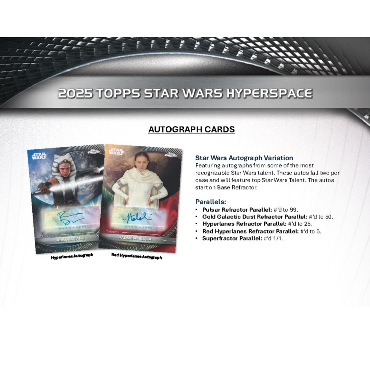 Autographs from major Star Wars talent fall two per case with multiple refractor parallels, while sketch cards—including planet-specific variants, oversized panoramic sketches, and Widevision Chrome inserts—add a premium artistic dimension. Each Hobby Box averages four numbered cards, one Nebulae Refractor, and delivers one Oversized Widevision Chrome card.