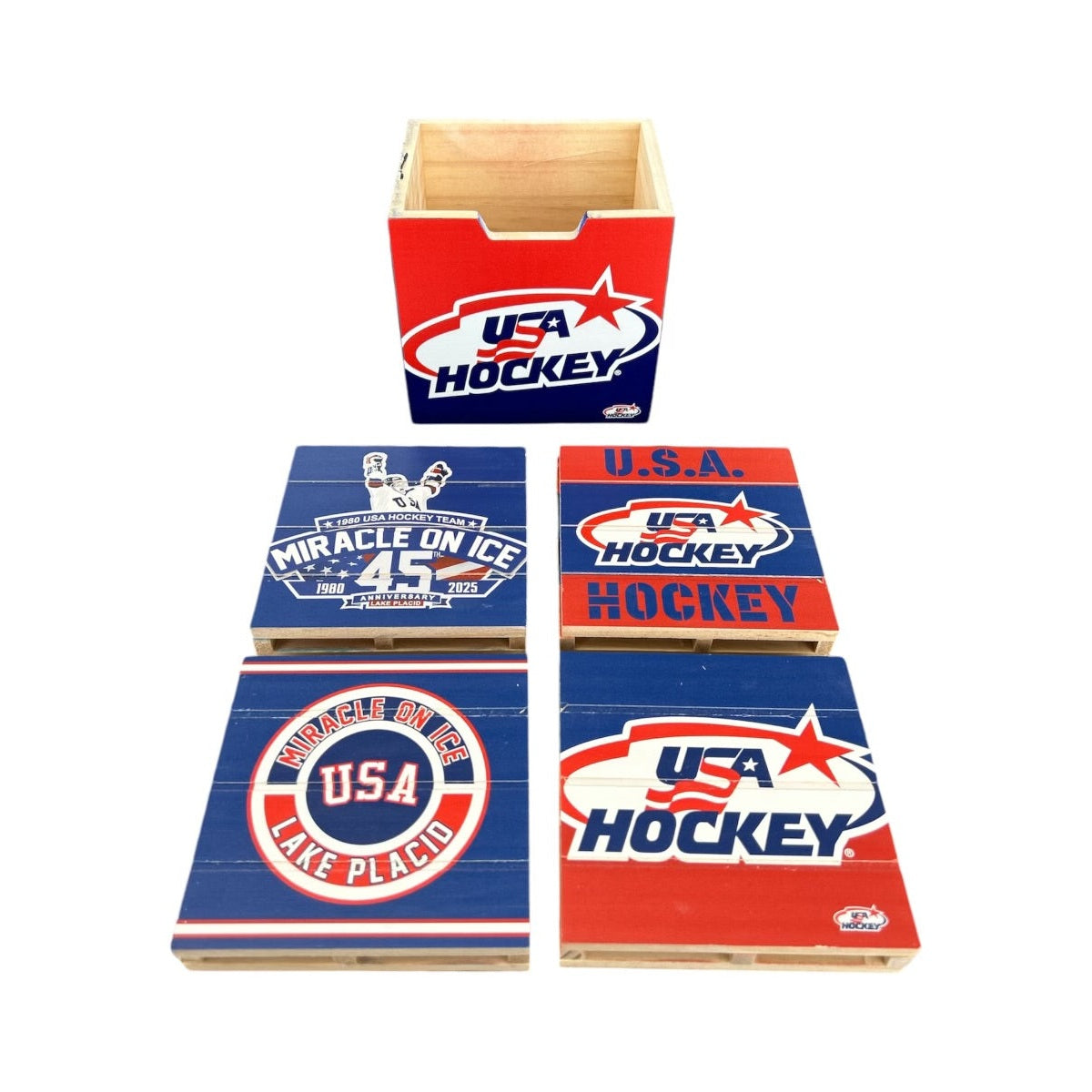 Championship moments belong in the spotlight—rings on the coffee table do not. Keep your fan cave clean on gameday with the USA Hockey Miracle on Ice 4 Pack Pallet Coaster Set. Designed for true fans, these wooden pallet-style coasters protect your surfaces while showcasing iconic USA Hockey pride inspired by one of the greatest moments in sports history.