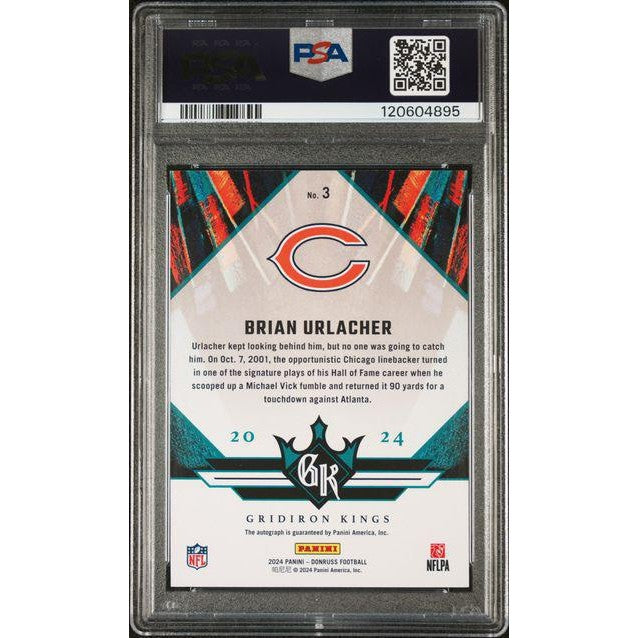 This Brian Urlacher 2024 Donruss All-Time Gridiron King Autograph #3 PSA 10 is a premium tribute to one of football’s most iconic defensive legends. Graded Gem Mint, this card captures Urlacher in the timeless Gridiron Kings artistic style—rich textures, bold portrait artwork, and an on-card signature that elevates the piece into true collector-grade territory. With flawless condition and a standout design, this is an elite addition for any Hall-of-Fame or Chicago Bears collector.