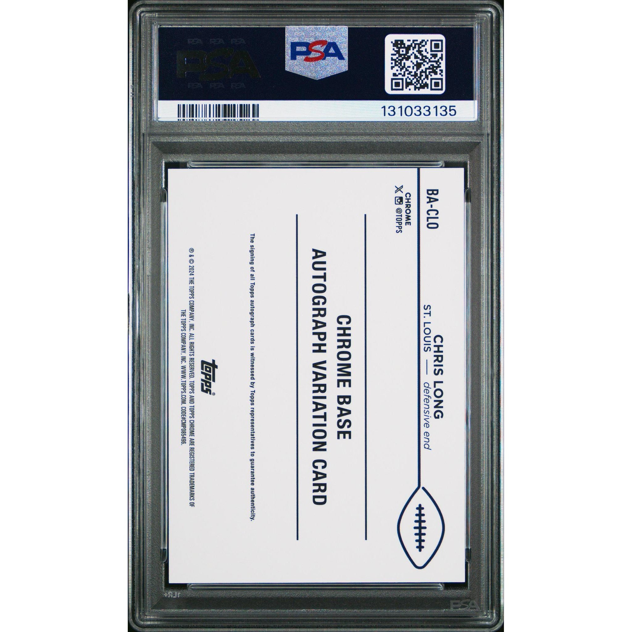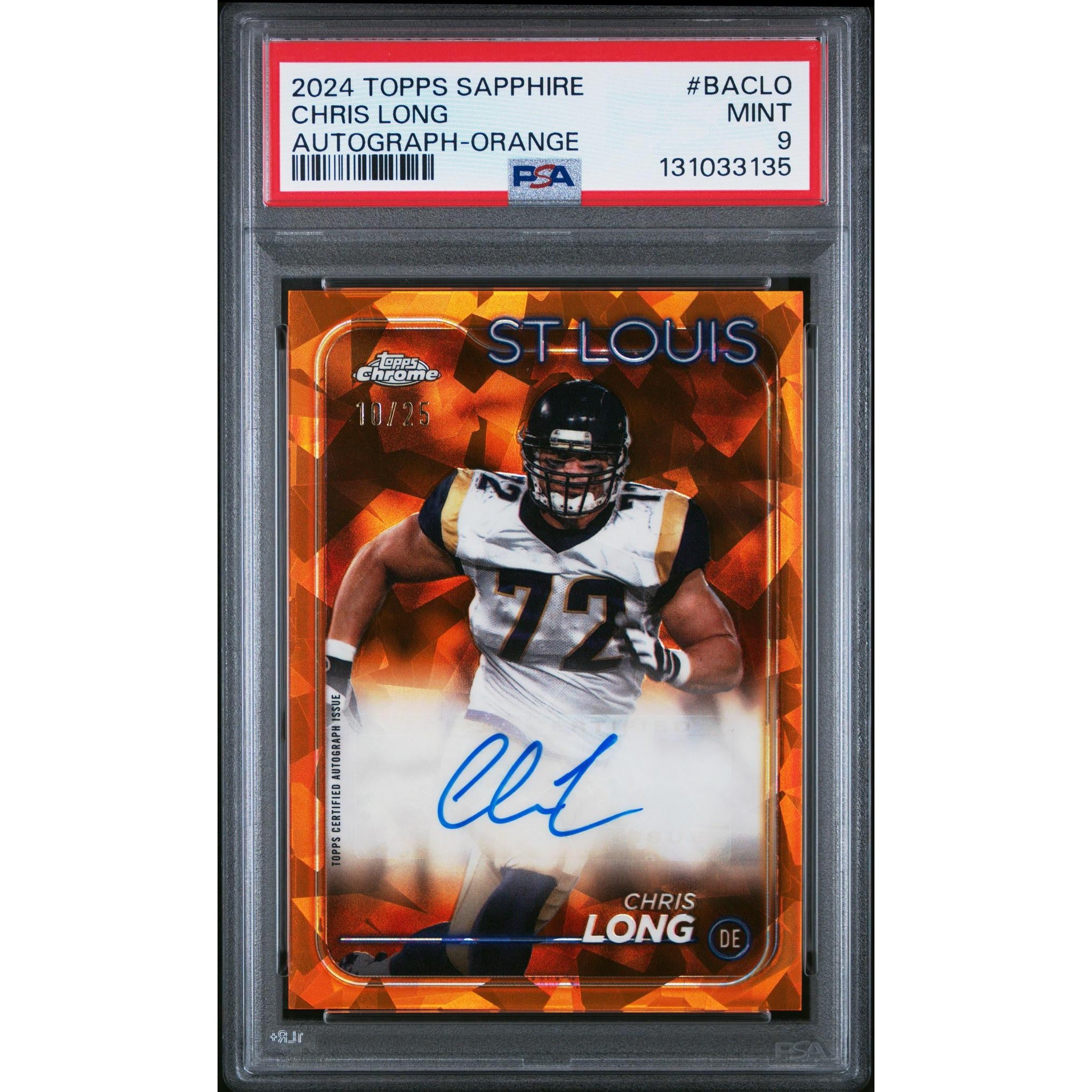Highlight your collection with this 2024 Topps Sapphire Autograph-Orange Chris Long #BACLO, graded PSA 9. This limited-edition Sapphire Orange parallel features an on-card autograph and a crisp, modern design, offering a standout combination of rarity and player significance. With only 25 copies produced, this serial-numbered 10/25 card brings strong appeal for Eagles fans, Long collectors, and modern autograph enthusiasts.