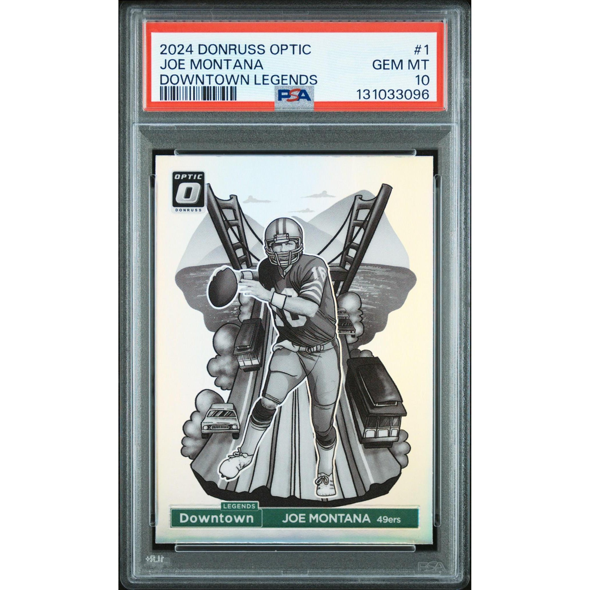 This Joe Montana 2024 Donruss Optic Downtown Legends #1 captures one of football’s greatest quarterbacks in one of the hobby’s most iconic case-hit inserts. The Downtown Legends design blends vibrant artwork, storyline-driven imagery, and Optic’s signature chromium shine to celebrate Montana’s legendary career. Graded PSA 10, this card offers top-tier condition and exceptional display value for serious collectors.