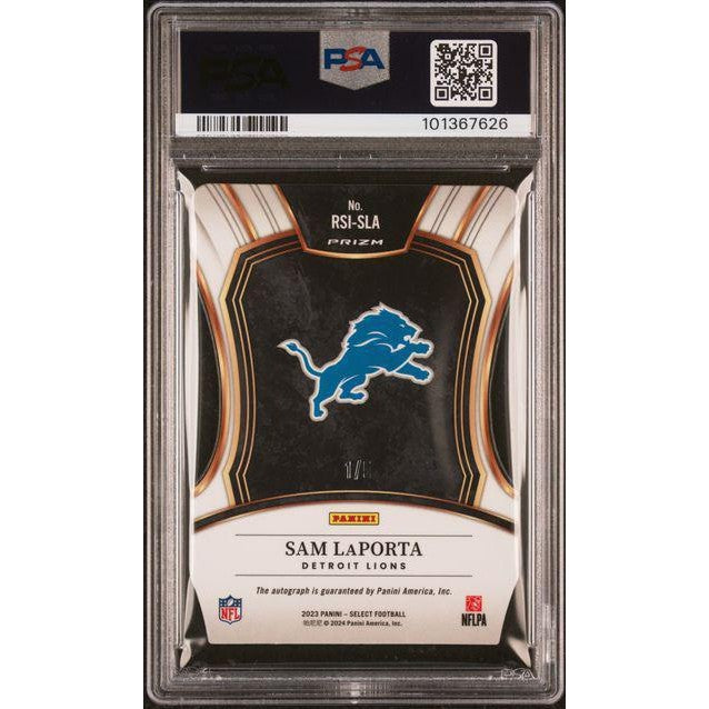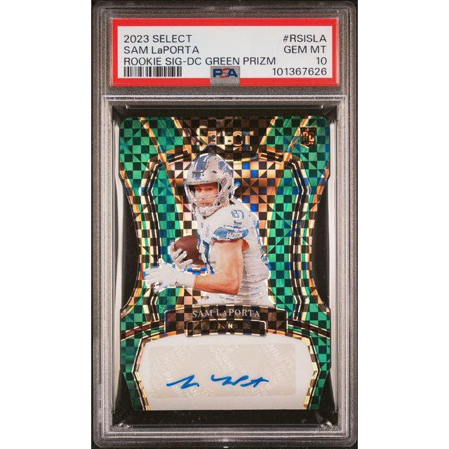 This Sam LaPorta 2023 Panini Select Rookie Sig-DC Green Prizm #RSISLA PSA 10 is a standout premium collectible featuring one of football’s fastest-rising young stars. The Green Prizm parallel delivers bold color and eye-catching shine, while the Rookie Signature design adds significant long-term value. Graded PSA 10, this card is in flawless condition—perfect for serious collectors, investors, and fans building a high-end modern NFL collection.