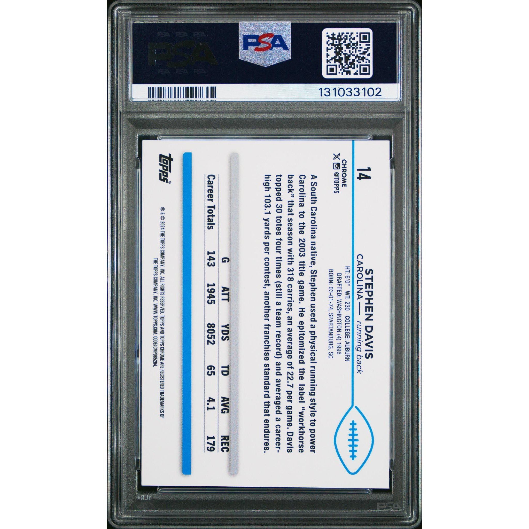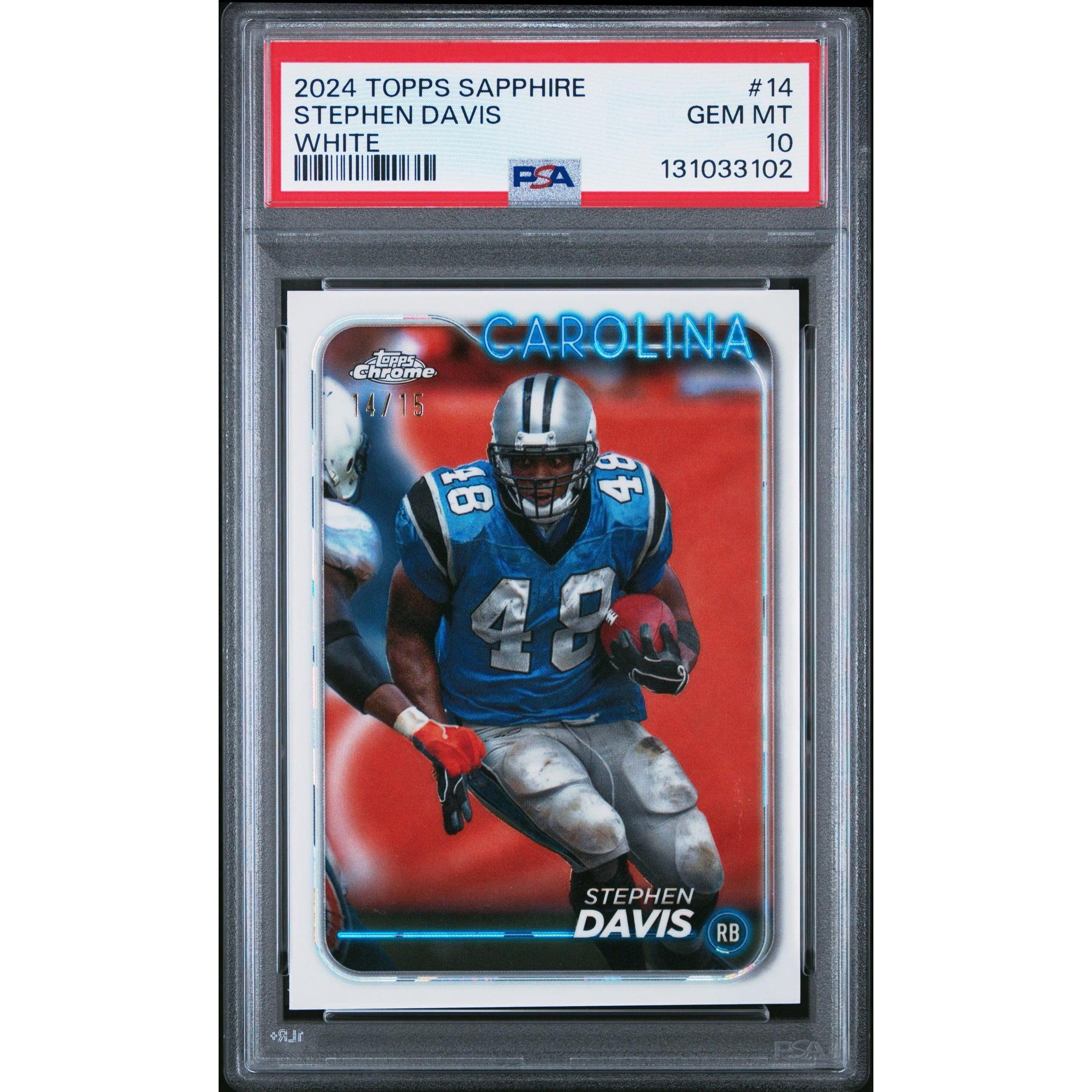 Elevate your collection with the 2024 Topps Sapphire White Stephen Davis #14, graded a flawless PSA 10. This clean, sharp White parallel highlights the former Pro Bowl running back with Topps’ signature Sapphire finish—crisp, modern, and highly display-worthy.