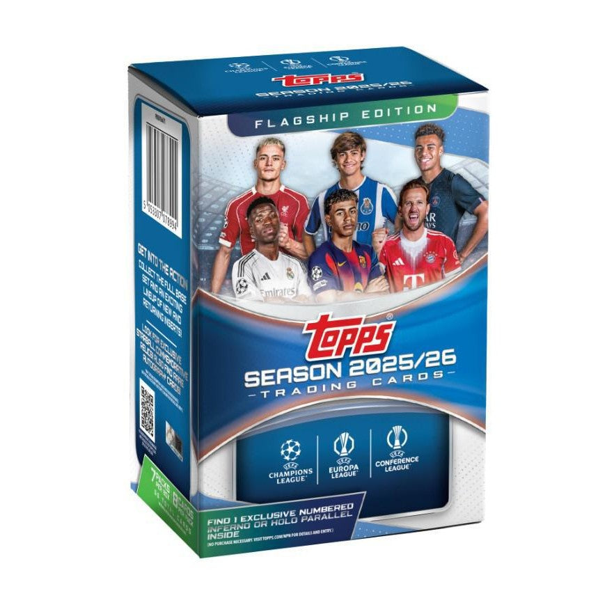 Topps UEFA Club Competitions returns for the 2025–26 season with an exciting flagship blaster release highlighting the world’s top clubs, legendary veterans, and a new generation of emerging rookies. Designed for accessibility and value, this blaster box delivers vibrant parallels, updated inserts, and exclusive chase content that brings the excitement of UEFA competition to every pack.