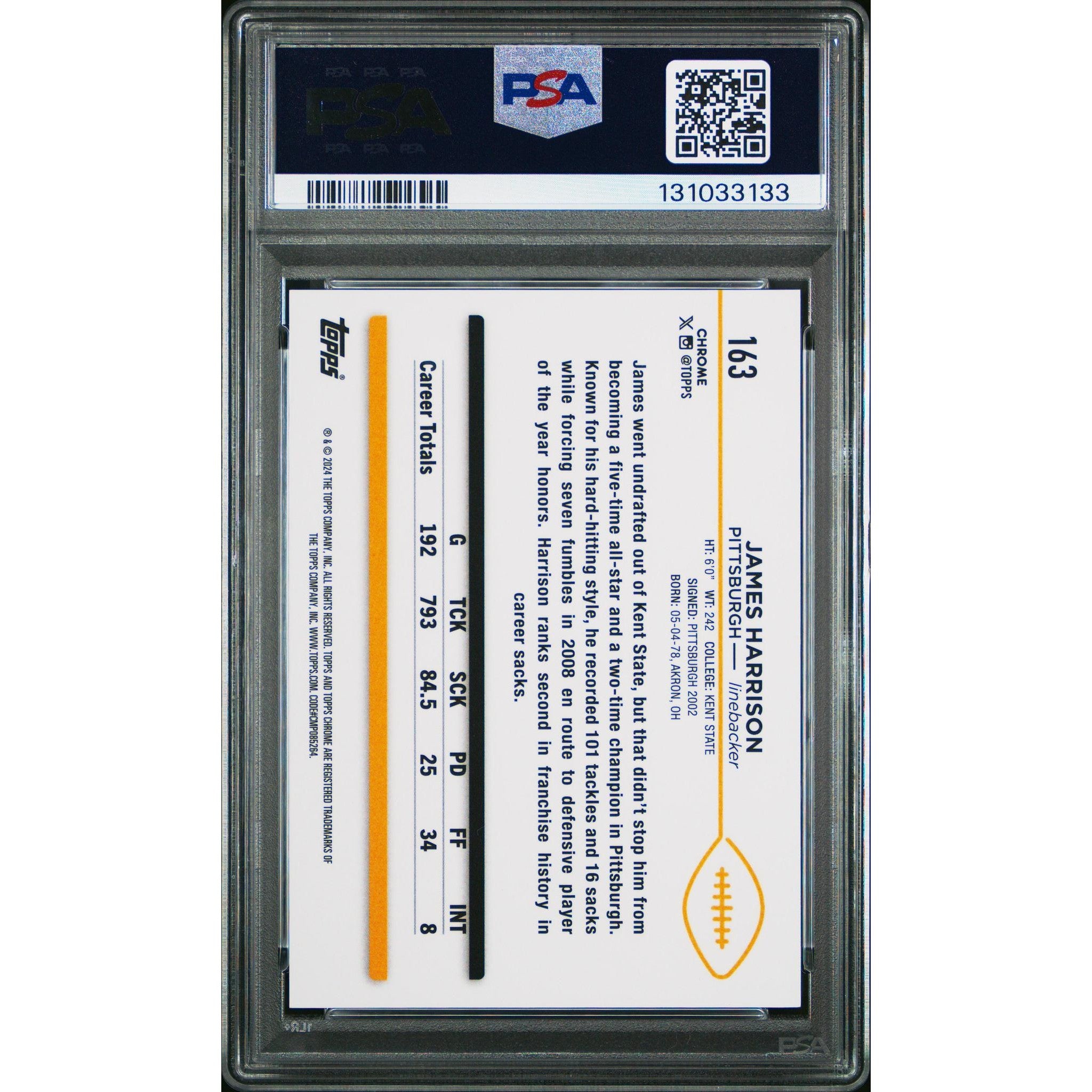Celebrate one of the NFL’s most feared defenders with this James Harrison 2024 Topps Sapphire Gold #163, professionally graded PSA 10 Gem Mint. Limited to just 50 copies, this stunning Sapphire Gold parallel stands out with its premium chromium finish, sharp edges, and crystal-clean surfaces—further elevated by the eye-catching, numbered 39/50