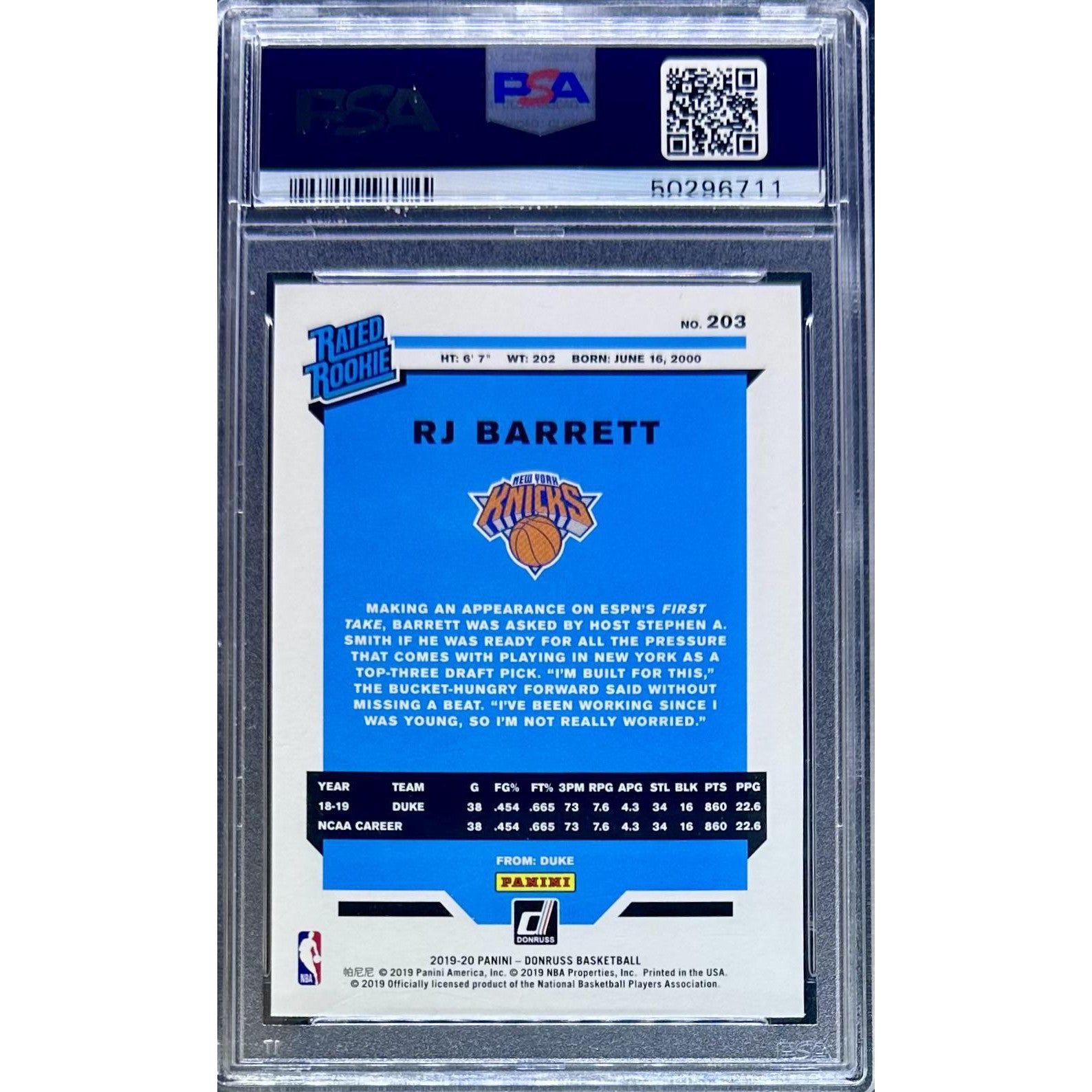 Celebrate one of the NBA’s brightest young stars with the RJ Barrett 2019 Panini Donruss #203 rookie card, graded PSA 10. This pristine card showcases Barrett in his early NBA career with sharp printing, vibrant colors, and flawless centering. PSA 10 grading guarantees gem-mint condition, making this card a cornerstone for collectors seeking high-value, investment-grade NBA memorabilia. A must-have for fans and investors alike, it represents Barrett’s rise as a dynamic scorer and playmaker.
