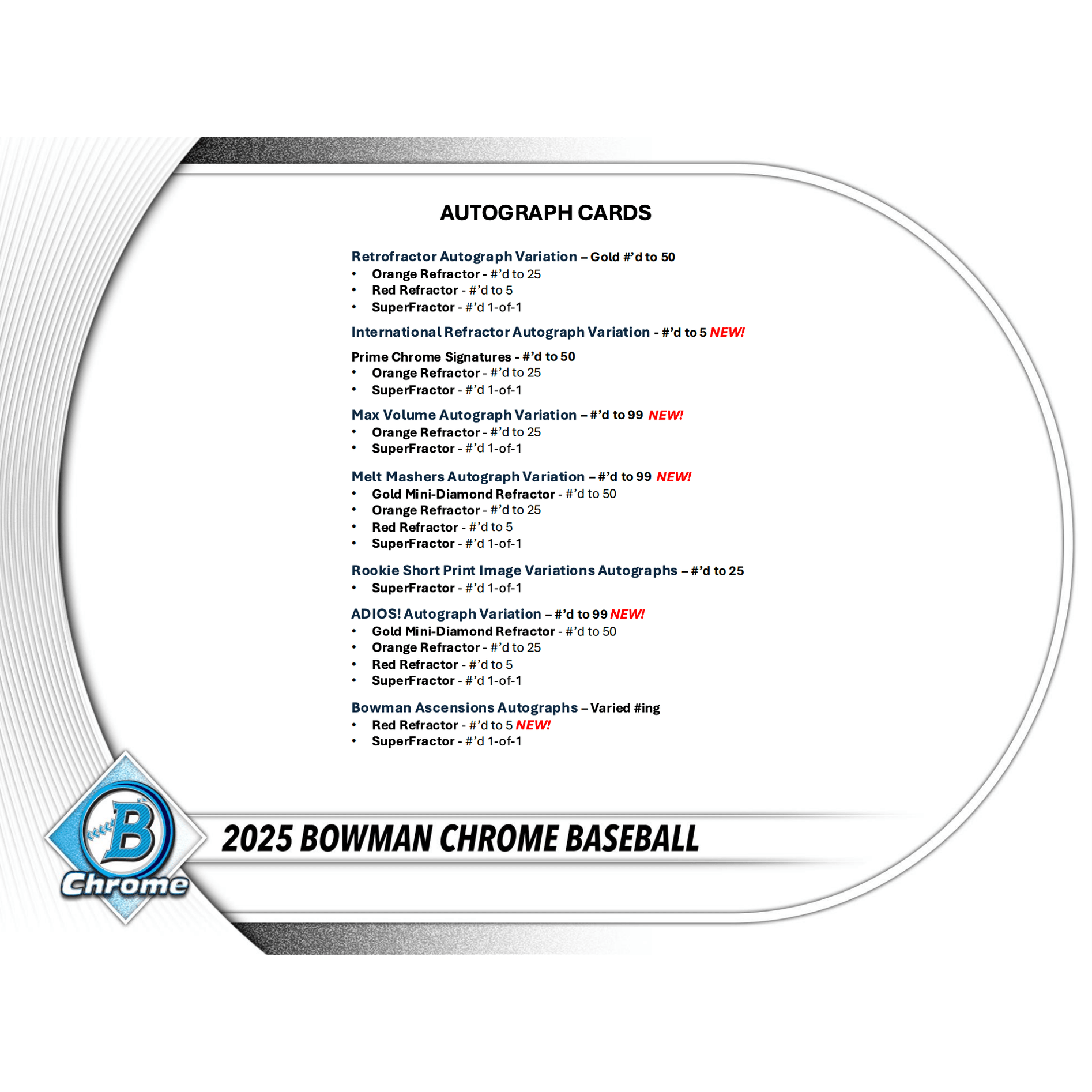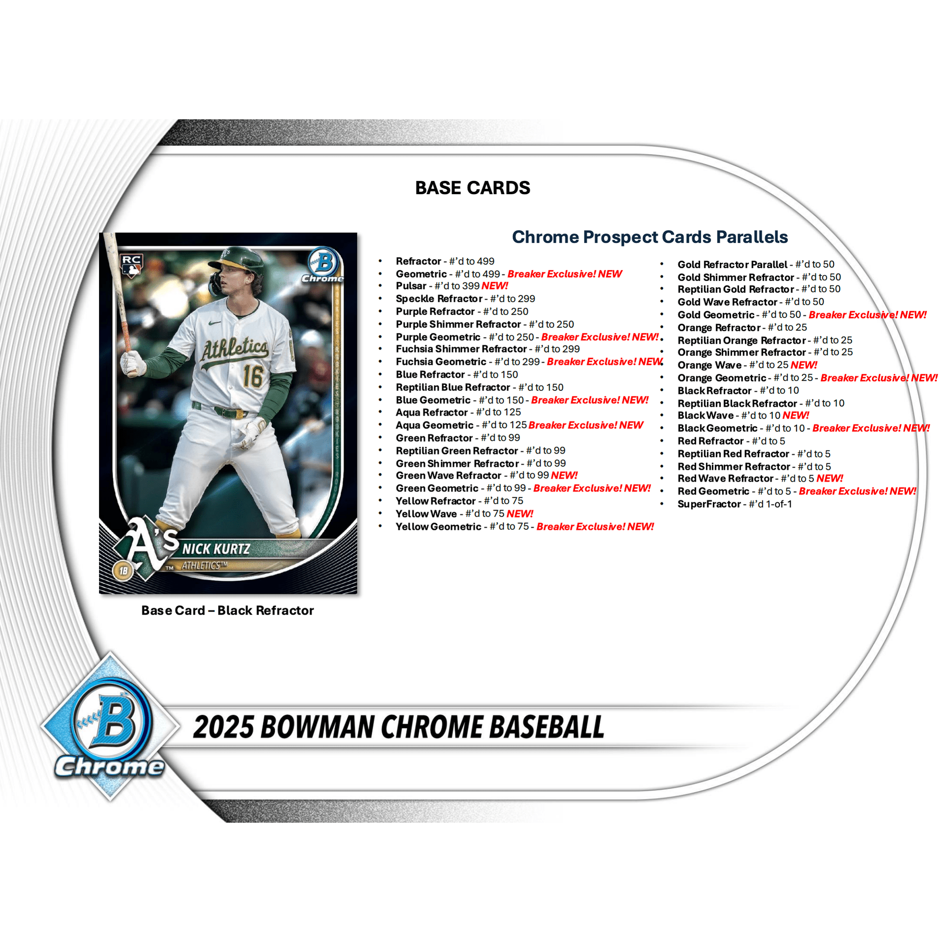 Bowman Chrome Baseball returns in 2025 with an electrifying lineup of the game’s most anticipated prospects and rookies! Breaker Delight Boxes are loaded with exclusive content, highlighted by 3 Chrome Autographs per box and Breaker Exclusive Geometric parallels across base, prospects, and inserts.
