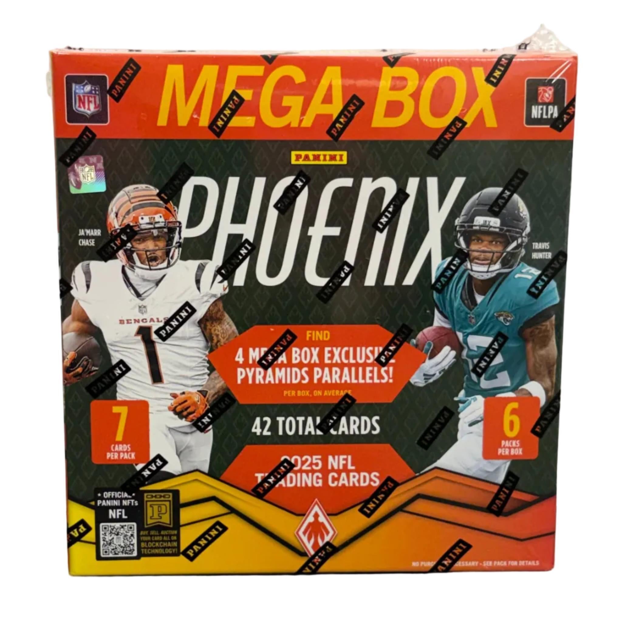 The 2025 Panini Phoenix Football Mega Box delivers bold design, vibrant parallels, and exciting chase potential in an accessible retail format. Known for its electric card styles and dynamic rookie content, Phoenix continues to be a favorite among collectors looking for eye-catching cards with strong modern appeal. Each Mega Box offers a balanced mix of base cards, inserts, and exclusive parallels that make every pack engaging to open.