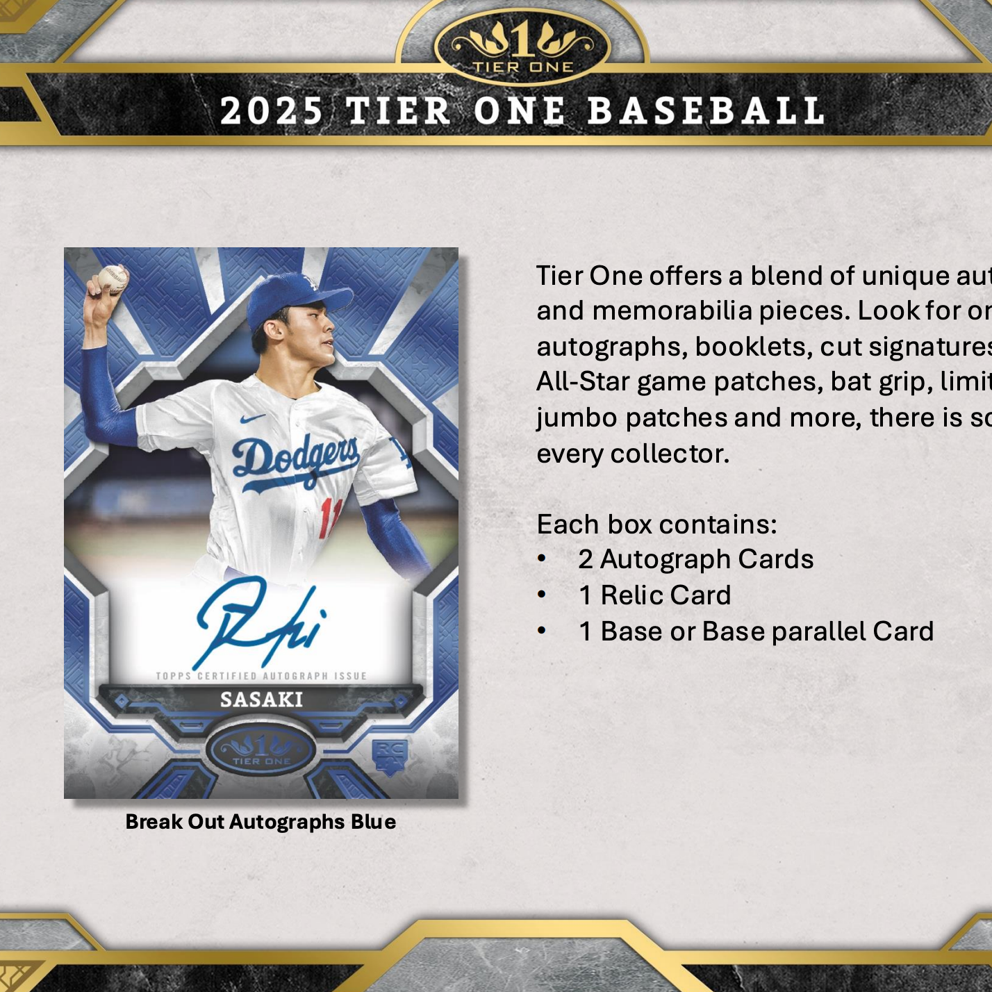 The premium Topps Tier One Baseball brand returns in 2025 with an incredible mix of on-card autographs, premium relics, and hobby-exclusive inserts. Each box delivers 2 autographs and 1 relic, plus a base or parallel, making every rip feel special.