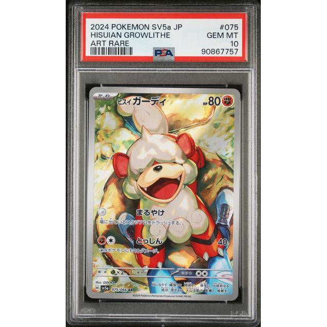 Add a touch of regional charm to your collection with the 2024 Pokémon Japanese SV5a Hisuian Growlithe Art Rare #075, graded PSA 10 Gem Mint. This beautifully illustrated card from the Crimson Haze set highlights the noble and loyal nature of Hisuian Growlithe in stunning Art Rare detail. With pristine condition and vibrant Japanese printing, this card stands out as a must-have for collectors and fans alike.