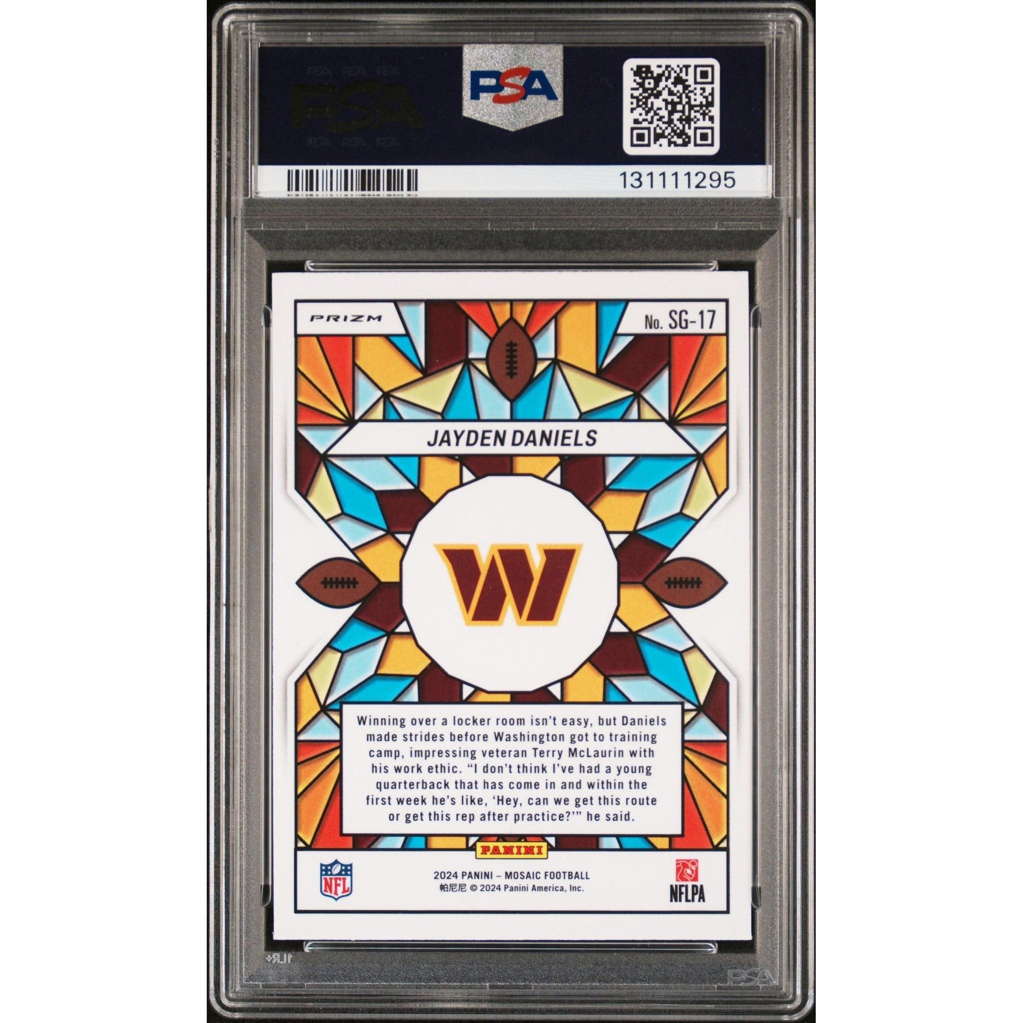 Capture the brilliance of a rising NFL star with the Jayden Daniels 2024 Mosaic Stained Glass #SG17 PSA 8. This stunning insert from Panini’s Mosaic collection showcases Daniels in a radiant stained-glass design—one of the most sought-after parallels in modern football card collecting. The vibrant color mosaic pattern highlights every detail of his poised presence on the field, making it a standout piece for any collection.
