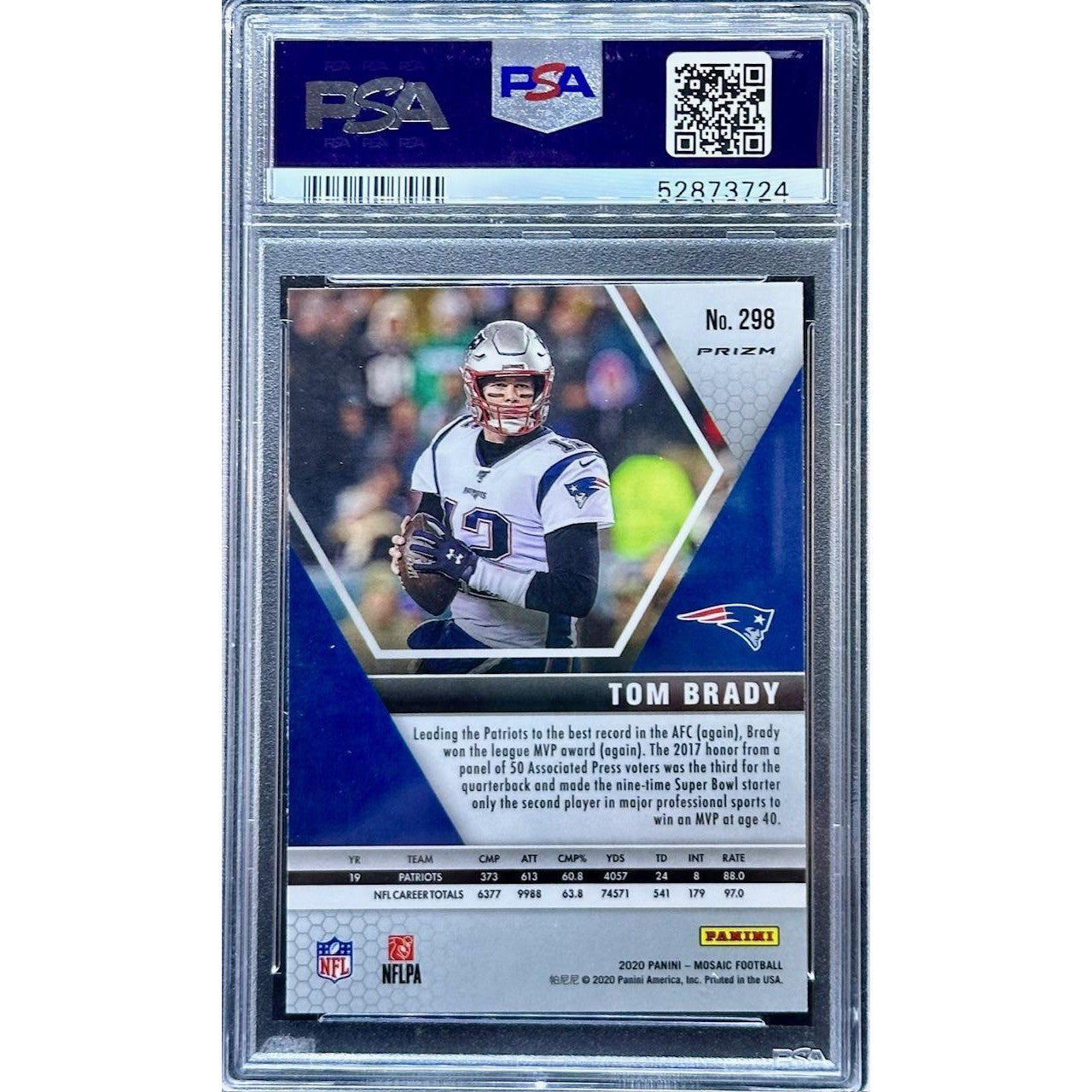 Celebrate the legacy of one of football’s greatest quarterbacks with the Tom Brady 2020 Panini Mosaic Reactive Orange #298 PSA 10. This premium collectible card features Brady in his prime, highlighted by the striking Reactive Orange Mosaic parallel that captures light and movement for a dynamic display.