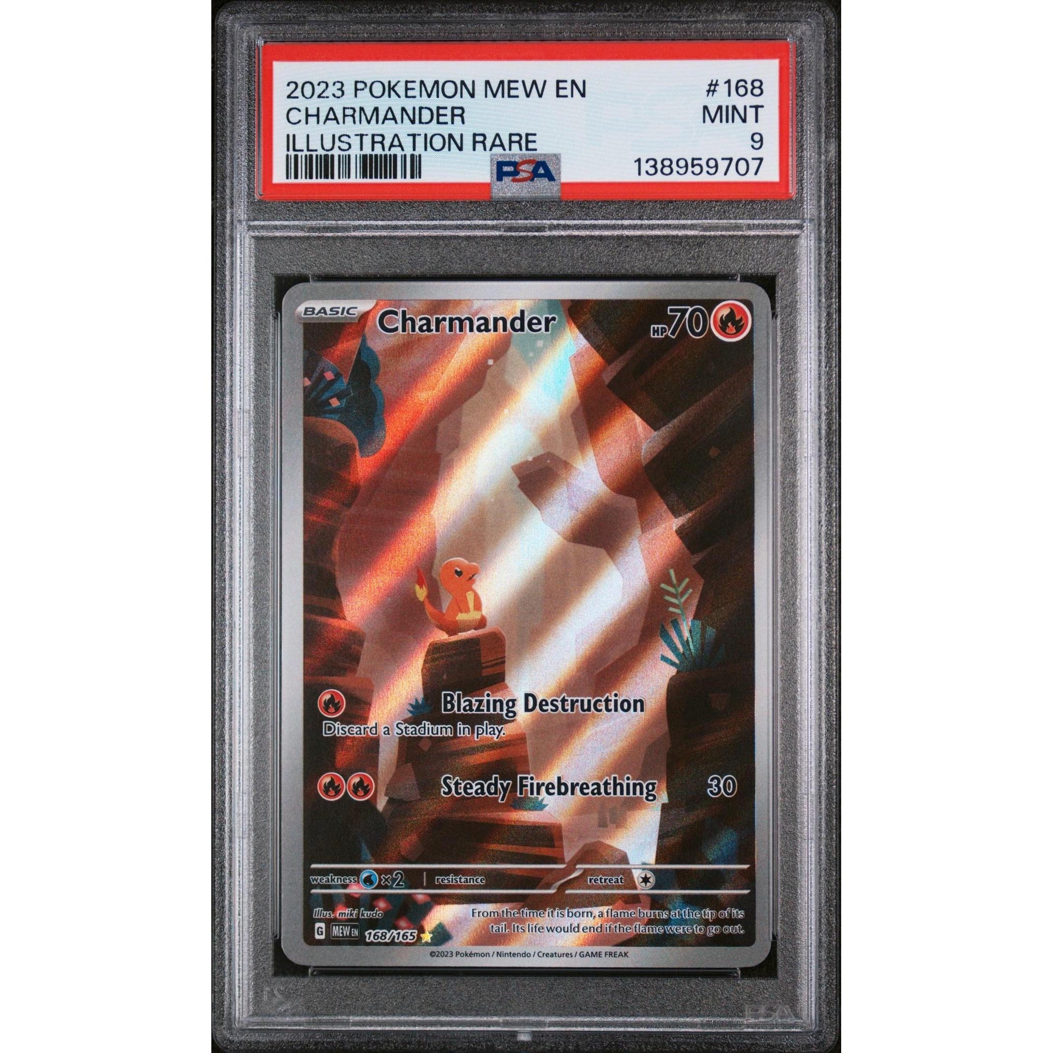 Graded PSA 9 Mint, the card offers strong eye appeal with clean surfaces and crisp detail throughout the artwork. As part of the MEW expansion, this Illustration Rare Charmander holds lasting appeal for collectors who value iconic Pokémon presented through contemporary, high-quality design.