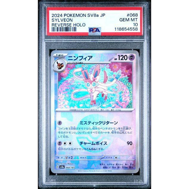 This PSA 10 Sylveon from the 2024 Pokémon SV8a Japanese set highlights one of the most popular Eeveelutions in a clean, beautifully finished Reverse Holo treatment. Graded Gem Mint by PSA, the card showcases vibrant artwork and flawless surface quality—making it an ideal choice for collectors seeking premium Japanese releases and perfect-condition holo cards.
