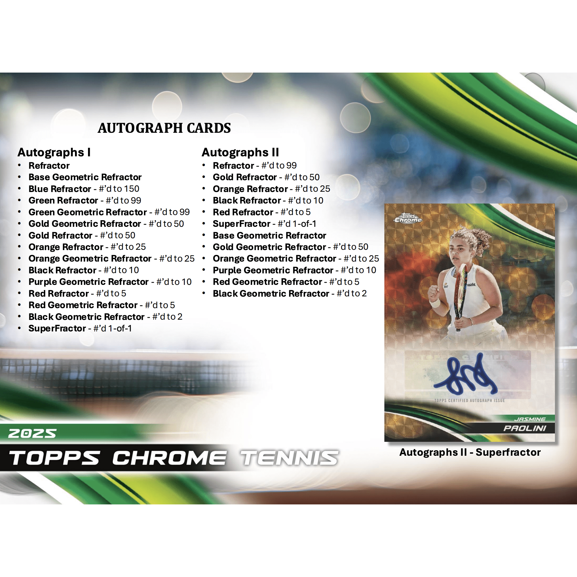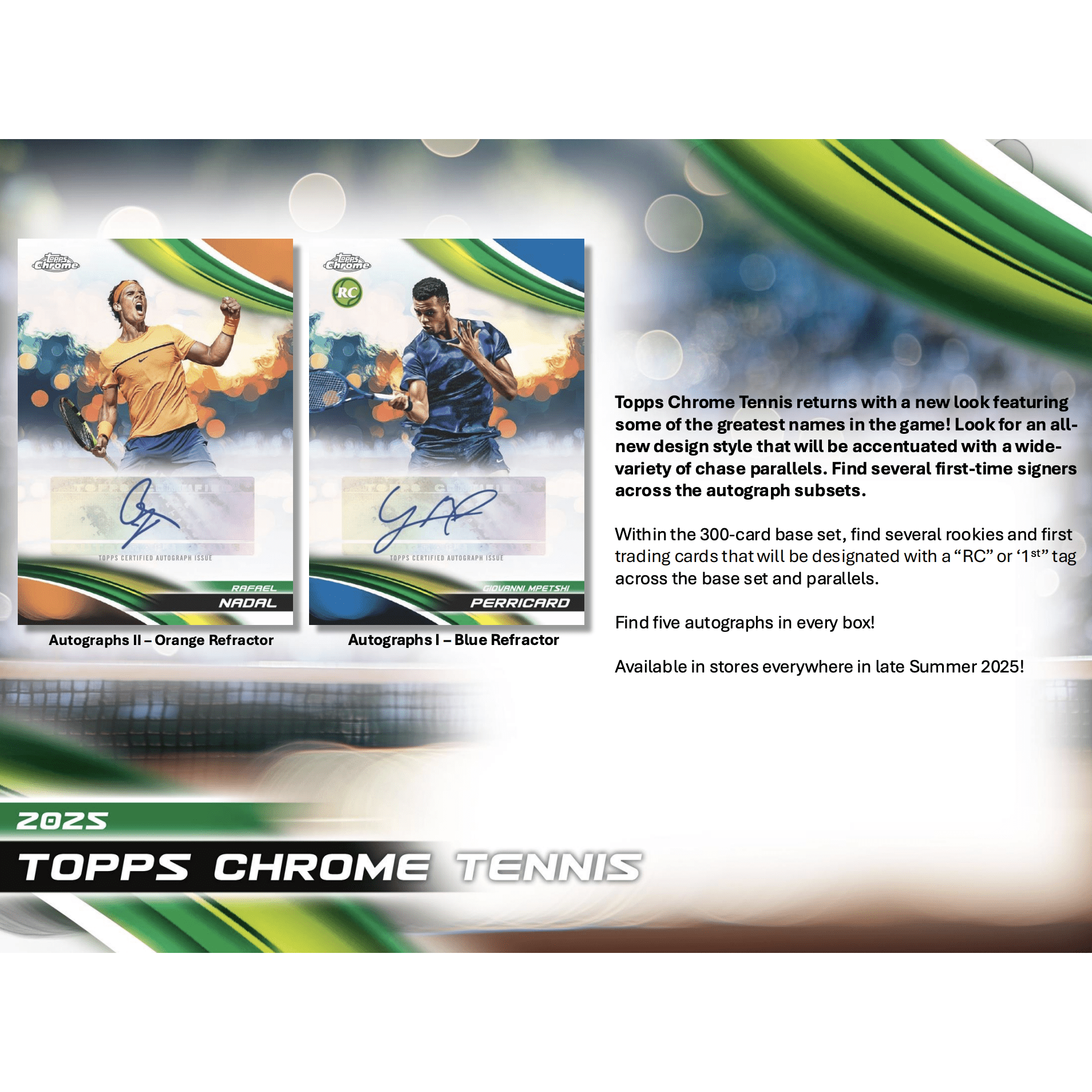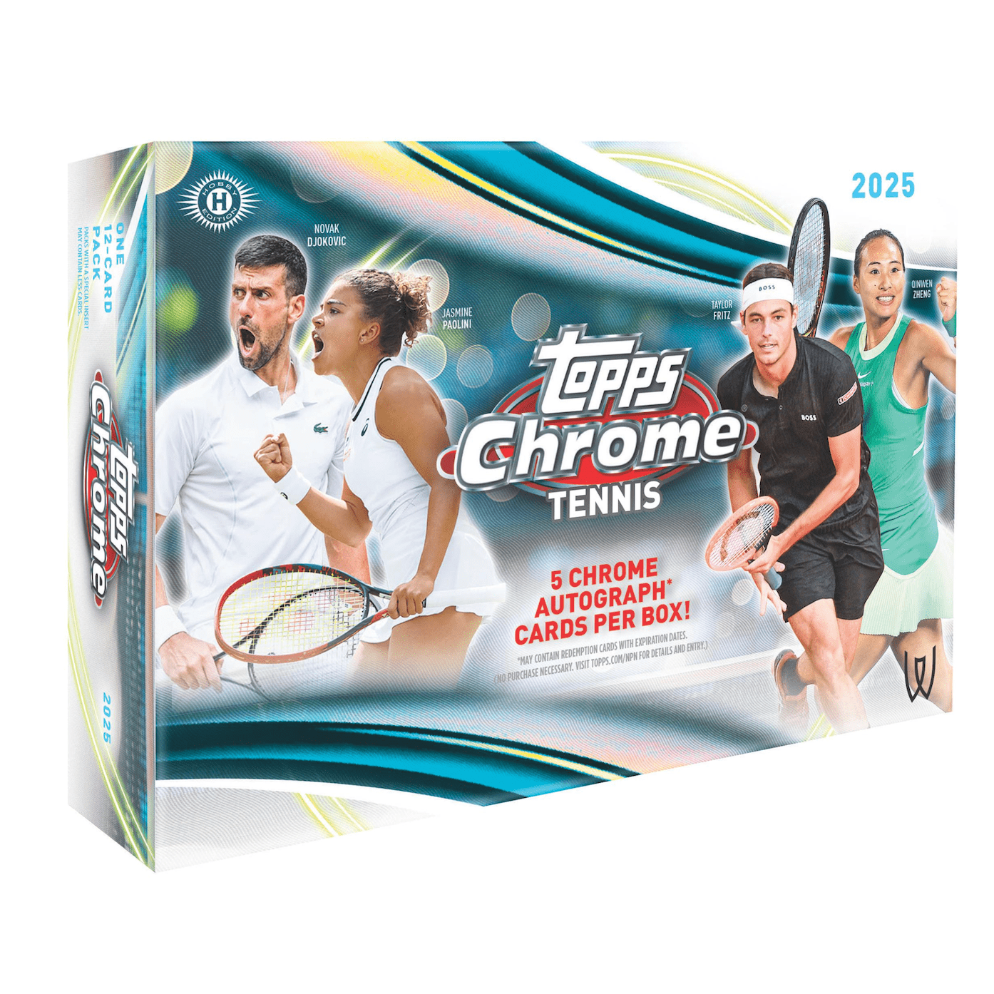 Topps Chrome Tennis returns in 2025 with a bold new design and a premium Breakers Delight configuration built for high-end collectors and breakers. This release features a 300-card Chrome base set showcasing legends of the game, today’s stars, and emerging rookies, including RC and 1st cards throughout. Collectors can chase a deep rainbow of Chrome and Geometric parallels, highlighted by low-numbered, SuperFractor, and Frozenfractor variations. With several first-time signers and exclusive Geometric autograph content, this product delivers strong hit density and premium upside in every box.