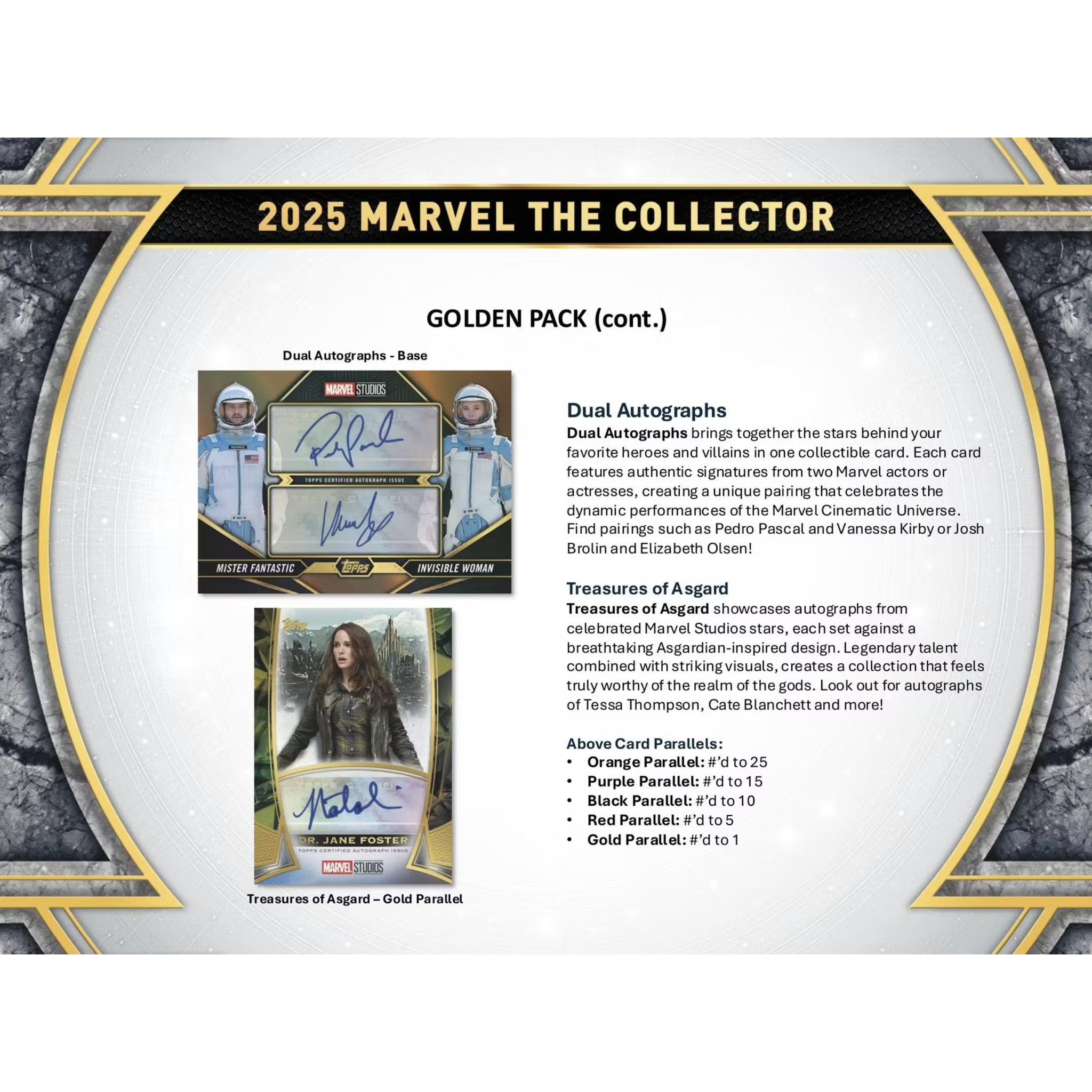The journey begins with the Perfection Pack, featuring Marvel Perfection cards that unite legendary characters and new MCU icons in an elegant, limited, serial-numbered design. The Mystery Pack expands the chase with premium inserts, including future-focused heroes, unforgettable cinematic moments, villain showcases, hand-drawn sketch cards, and the ultra-rare Infinity Gauntlet cards that build toward a fully completed 1-of-1 Gauntlet. The experience culminates in the Golden Pack, where collectors can uncover autograph cards from some of Marvel’s biggest on-screen stars, including multi-signature and themed autograph sets designed as true centerpiece collectibles.