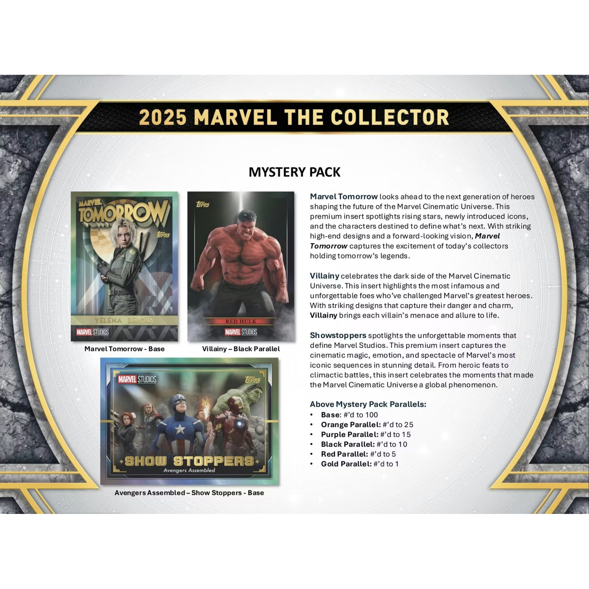 Step inside The Collector’s cosmic gallery with 2025 Topps Marvel The Collector, a premium, high-end release built for serious Marvel fans and collectors. Each Hobby Box delivers three one-card packs that together create a museum-quality experience, spotlighting the most iconic heroes, villains, moments, and stars from the Marvel Cinematic Universe.