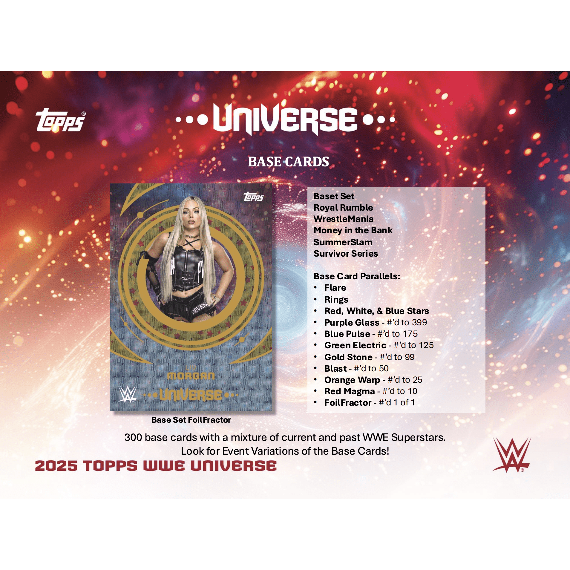 Topps Universe WWE makes its long-awaited debut in 2025 with a bold, high-energy design and a deep checklist celebrating WWE Superstars past and present. This Hobby Box builds around a massive 300-card base set featuring current champions, legendary icons, and fan favorites, with Event Variations tied to WWE’s biggest stages including Royal Rumble, WrestleMania, Money in the Bank, SummerSlam, and Survivor Series.