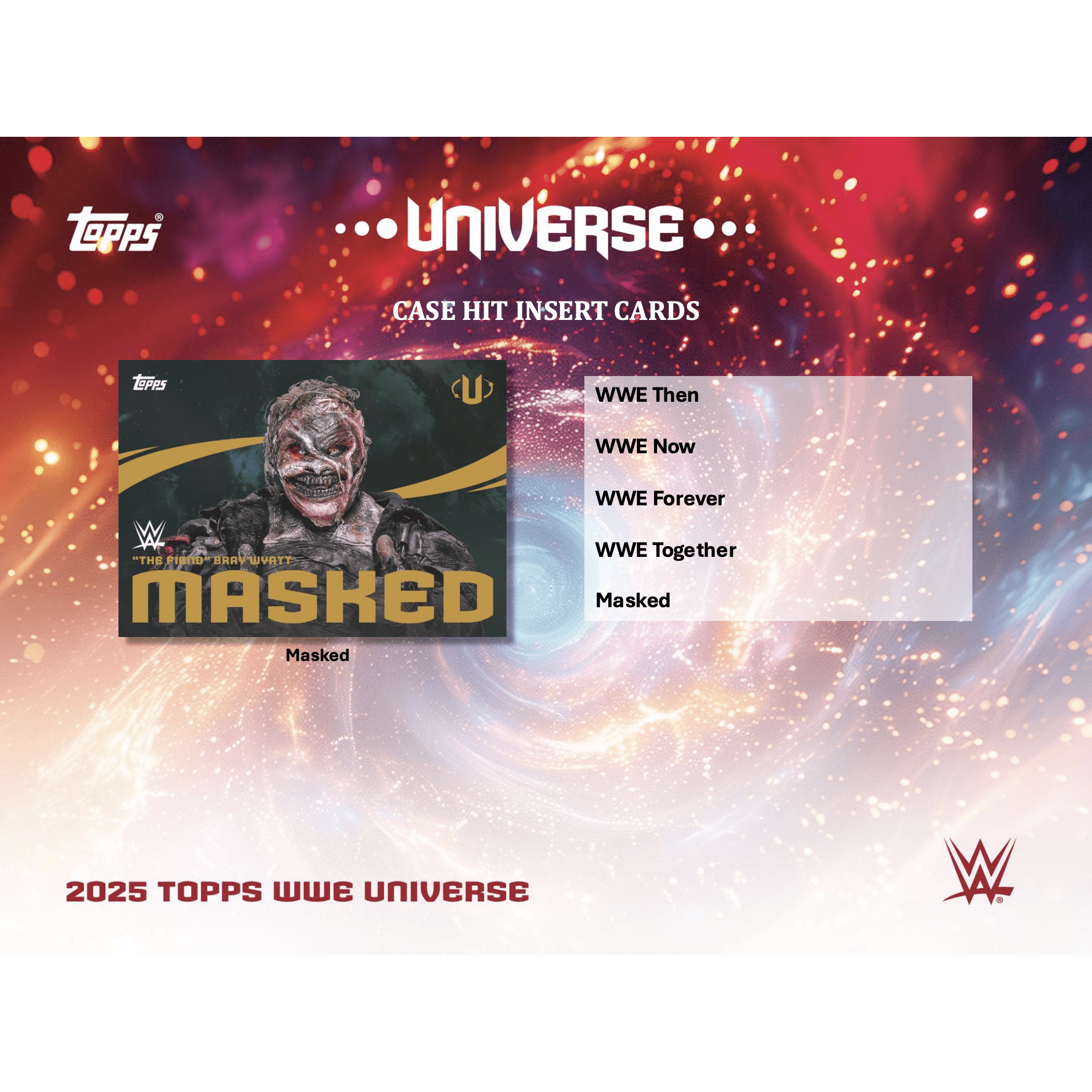 Collectors can chase a wide range of colorful, serial-numbered parallels highlighted by stunning FoilFractor 1-of-1s, along with a strong insert lineup that brings factions, rivalries, international stars, and breakout talent to the forefront. The true chase lies in the short-printed case hit inserts—including WWE Then, WWE Now, WWE Forever, WWE Together, and Masked—some of the most visually striking and collectible cards in the release.