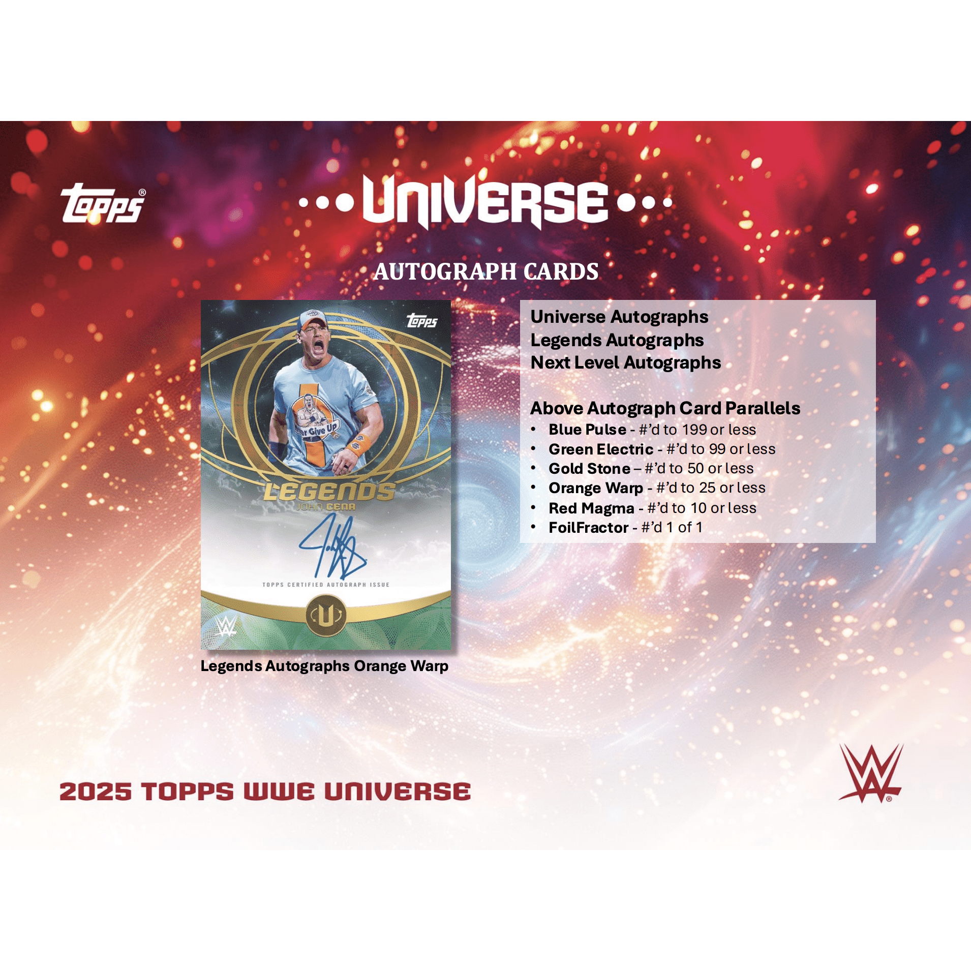 Autographs are a major focus in Hobby Boxes, featuring Universe Autographs, Legends Autographs, and Next Level Autographs, with multiple numbered parallels and premium FoilFractor one-of-ones. Collectors can also uncover high-end relic and relic autograph cards, including Superstar Relic Signatures, Tag Team Duals, Title Marks, and Ringside Relics, combining authentic memorabilia with elite WWE signatures.